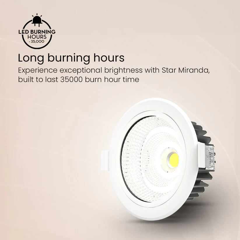 Introducing Star Miranda, the epitome of ceiling lighting innovation. Crafted with tiltable design for customizable illumination. Enjoy peace of mind with surge protection and a generous 2-year warranty. Powered by superior COB technology, it delivers unmatched brilliance and longevity.