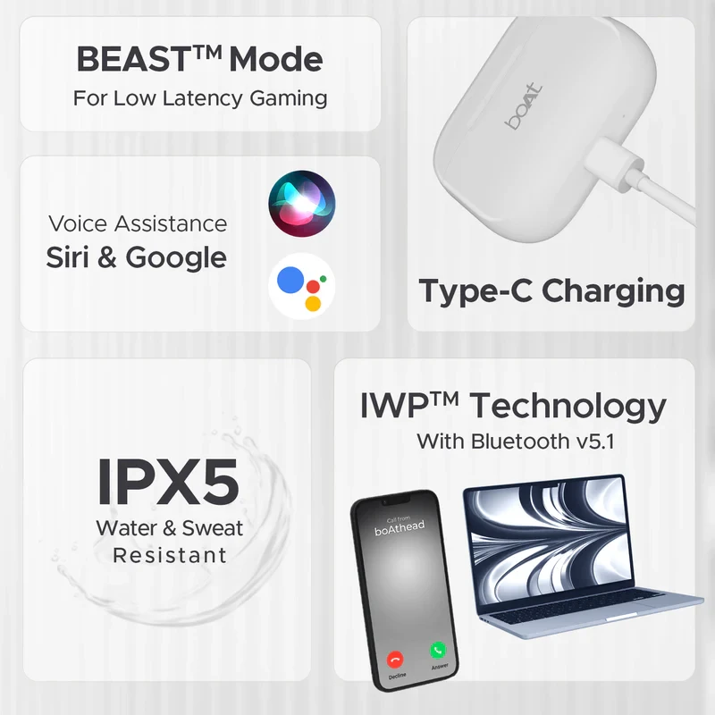 12+3 Months Warranty i 7-day Replacement Free Express Delivery* GST Billing Description Reviews (519) boAt Airdopes 161 - Wireless Earbuds Your partner for every vibe, Airdopes 161 earbuds pumps uninterrupted music with its massive playback of upto 40 Hours. And when you run out of battery, you can enjoy 180 Minutes of music with just 10 Minutes of charge. Grooving has never been so hasslefree with Bluetooth v5.1 that seamlessly plays your music. Gone are the days when you had to check if your device is connected or not. Our. connects with your paired devices as soon as you open the lid of the case. Indulge in our immersive sound with its 10mm driver and enjoy music for every vibe. AIRDOPES 161 Charge for 10 Minutes, ENJOY 180 Minutes     IPX5 WATER & SWEAT RESISTANCE Ace your sport. You don’t have to worry about your Airdopes as you groove to your favourite workout tracks.     boAt Immersive Sound Get captivated by boAt immersive sound powered by 13mm drivers no matter what you are playing. The bass is tuned for a thumping listening experience that transports you to another world.     Type C Interface Type C interface promises — speed, ease of use, versatility. Say goodbye to your charging struggles.     Quick Response Touch Controls Control your music with ease. Play/pause, attend calls and activate voice assistants via just a touch.     FAQs Q. How can we pause and play tracks? Q. Can we accept calls on boAt Airdopes 161? Q. Can I use any adapter to charge my device? Q. How long does boAt Airdopes 161 last on a single charge? Q. How long does it take to charge? Q. Can I charge my earphones while the case is being charged? Q. What is the use of the charging case? How long does it take the charging case to charge? View More DOWNLOAD MANUAL 40 Hours of battery life Active Voice Assistance boAt immersive sound IPX5 Sweat & Water Resistance Product Specifications Name boAt Airdopes 161 Category Wireless Earbuds Net Content 1 Unit Airdopes 161, 1 Unit Type-C, 1 Unit User Manual, 1 Unit Warranty Card Product Dimensions 31mm x 22mm x 26mm MRP(Inclusive All Taxes) ₹2,490 Country Of Origin India Marketed By Imagine Marketing Limited, Unit No. 204 & 205, 2nd floor, D-Wing & E- wing, Corporate Avenue, Andheri Ghatkopar Link Road, Andheri East, Mumbai - 400093 Manufactured by Califonix Tech & Manufacturing Pvt. Ltd., B-17, Sector 85, Phase II, Noida, Gautam Buddha Nagar, Uttar Pradesh-201305, India. For consumer complaints contact us at: 022-6918-1920 info@imaginemarketingindia.com Imagine Marketing Limited Address: Unit No. 204&205, D-wing & E-wing, Corporate Avenue, Andheri Ghatkopar Link Road, Andheri East, Mumbai-400093 Net Quantity 1 Unit IPX IPX5 Driver Size 10mm*2 Charging Time 35 min (Earbuds); 1.5H(Case) Bluetooth V5.1 Beast Mode Yes ASAP Charge Yes; 10 mins = 180 mins Noise Cancellation ENx™ Technology