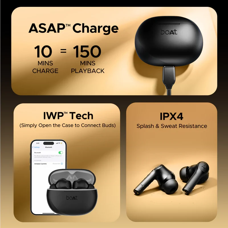 12+3 Months Warranty i 7-day Replacement Free Express Delivery* GST Billing Description Reviews (192) BEAST™ Mode Multi-point Connectivity ASAP™ Charge 50 Hours Playtime Product Specifications Name boAt Airdopes Supreme Category Wireless Earbuds Net Content 1 UNIT boAt Airdopes Supreme, 1 UNIT Type-C Cable, 1 UNIT User Guide, 2 UNITS Extra Earmuffs Product Dimensions 35.21mm x 17.83mm x 21.37mm MRP(Inclusive All Taxes) ₹5,990 Country Of Origin India Marketed By Imagine Marketing Limited, Unit No. 204 & 205, 2nd floor, D-Wing & E- wing, Corporate Avenue, Andheri Ghatkopar Link Road, Andheri East, Mumbai - 400093 Manufactured by Califonix Tech & Manufacturing Pvt. Ltd., B-17, Sector 85, Phase II, Noida, Gautam Buddha Nagar, Uttar Pradesh-201305, India. For consumer complaints contact us at: 022-6918-1920 info@imaginemarketingindia.com Imagine Marketing Limited Address: Unit No. 204&205, D-wing & E-wing, Corporate Avenue, Andheri Ghatkopar Link Road, Andheri East, Mumbai-400093 Net Quantity 1 Unit IPX IPX4 Driver Size 10mm*2 Charging Time 1.5 Hours (Case); 30 Mins (Earbuds) Bluetooth v5.2 Beast Mode Yes BEAST™ Mode 65ms Low Latency ASAP Charge Yes; 10mins = 150mins Noise Cancellation 4 mics ENx™ Technology