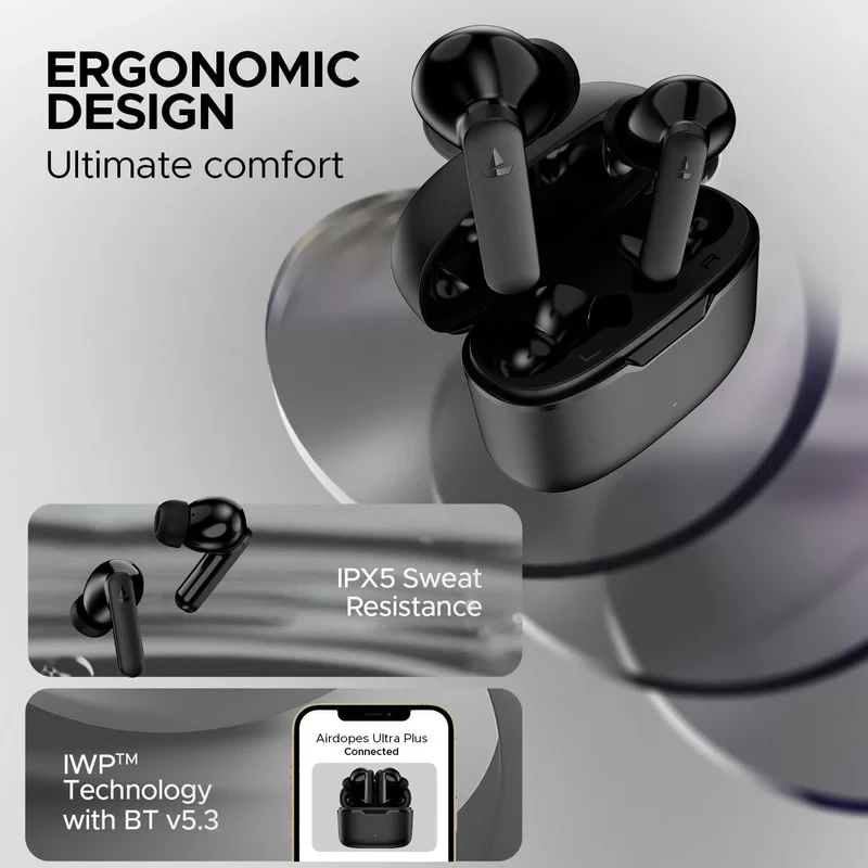 12+3 Months Warranty i 7-day Replacement Free Express Delivery* GST Billing Description Reviews (100) BEAST™ Mode Dual Mics with ENx™ Technology ASAP™ Charge 50 HRS Playtime Product Specifications Name boAt Airdopes Ultra Plus Category Wireless Earbuds Net Content 1 Unit Pair of Earbuds, 1 Unit Case, 1 Unit Type - C Cable, 1 Unit User Manual, 1 Unit Warranty Card, 1 Unit FAQ Card Product Dimensions 31.37mm x 20.22mm x 23.83mm MRP(Inclusive All Taxes) ₹4,990 Country Of Origin India Marketed By Imagine Marketing Limited, Unit No. 204 & 205, 2nd floor, D-Wing & E- wing, Corporate Avenue, Andheri Ghatkopar Link Road, Andheri East, Mumbai - 400093 Manufactured by Califonix Tech & Manufacturing Pvt. Ltd., B-17, Sector 85, Phase II, Noida, Gautam Buddha Nagar, Uttar Pradesh-201305, India. For consumer complaints contact us at: 022-6918-1920 info@imaginemarketingindia.com Imagine Marketing Limited Address: Unit No. 204&205, D-wing & E-wing, Corporate Avenue, Andheri Ghatkopar Link Road, Andheri East, Mumbai-400093 Net Quantity 1 Unit IPX IPX5 Driver Size 10 mm*2 Charging Time About 30min (Earbuds) ;up to 1.5 hours (Case) Bluetooth V5.3 Beast Mode Yes BEAST™ Mode 50ms low latency ASAP Charge Yes; 5mins = 60mins Noise Cancellation 4 mics ENx™ Technology