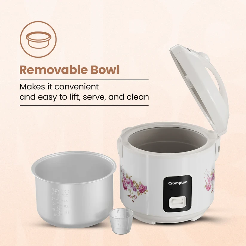 Cook delicious, fluffy rice in minutes with the Crompton 2.8L Electric Rice Cooker. It delivers perfectly cooked rice in just 15 minutes, making it ideal for quick, everyday meals. The large capacity ensures there’s enough for the whole family. With a 24-hour keep-warm function, your rice stays fresh and ready to serve whenever you are. It features 4-level protection, including overheat control and a secure lid lock for worry-free cooking. The airtight lid, steam vent, and removable non-stick bowl make usage convenient. The Crompton Rice Cooker combines speed, safety, and reliability for perfectly cooked rice, every time.