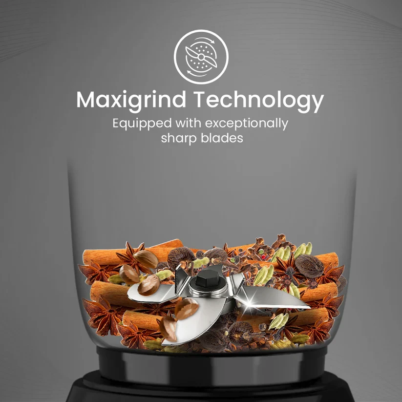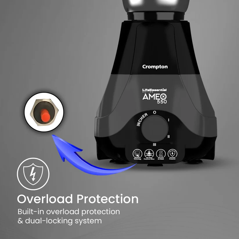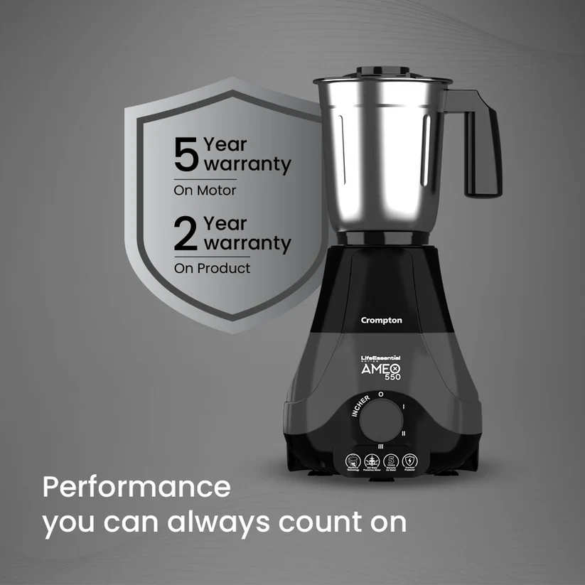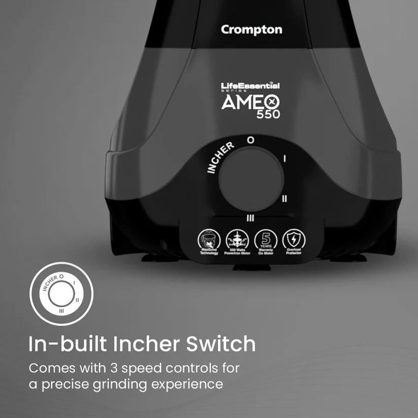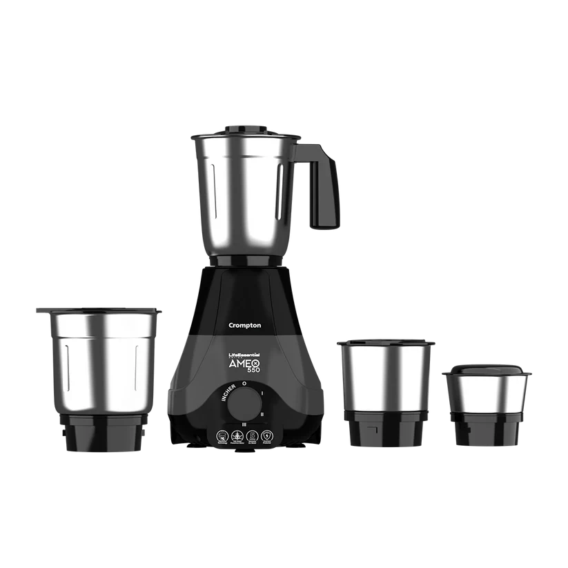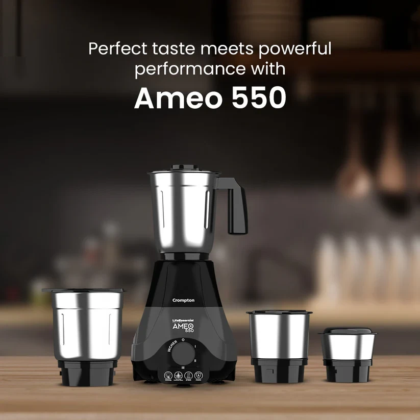 Compact yet reliable, the Crompton Ameo 550 Mixer Grinder is your everyday kitchen partner. With a 550W motor and multipurpose jars, it covers your basics without taking up extra space. The flow breaker design ensures even mixing, while the stainless steel blades provide precision performance. Its sleek body, safety lock, and multi-purpose jars make it a practical choice for modern kitchens. Its thoughtfully designed jars are perfect for both small and large quantities, from masalas to baby food. Easy to use and reliable, the Crompton Ameo 550 helps you cook with confidence while saving time in the kitchen.