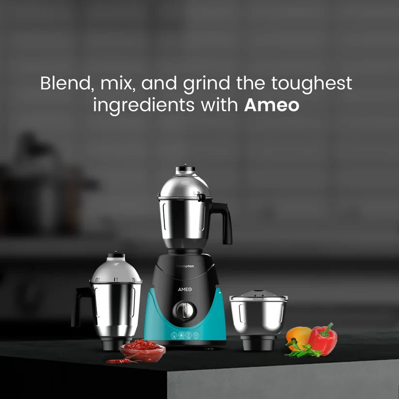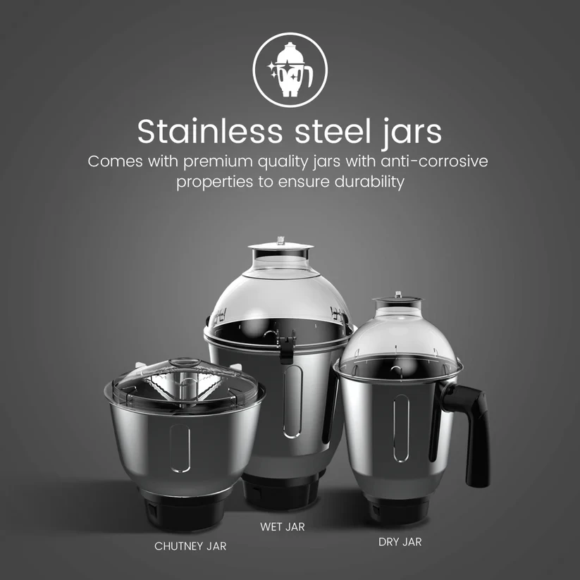For finest grinding experience get the Cromoton Ameo mixer gridner. It comes with three functions: grinding, mixing, and juicing. The mixer grinder is equipped with a 750-watt MaxiGrind technology motor that can grind even the hardest ingredients like turmeric and entire black gram. For safety, the motor comes with an overload protection feature. It comes with suction rubber feet for a sturdy grinding experience and premium finish that adds to the aesthetic of your kitchen.
