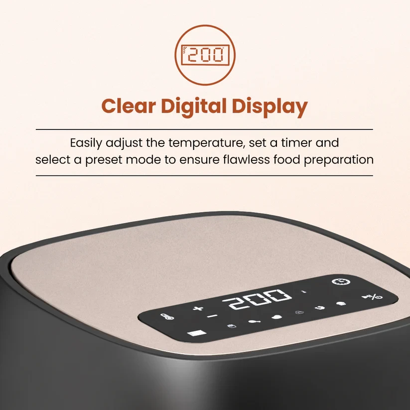 Enjoy your favorite fried snacks guilt-free with the Crompton Ameo Air Fryer. Powered by Quick Fry Technology, it circulates hot air evenly to deliver crispy, golden results with up to 80% less oil. With eight pre-programmed menus and a digital display for temperature and timer control, cooking your favourite dishes is effortless. The spacious capacity makes it ideal for family meals, while the see-through window lets you watch your food cook in real time. Engineered with SilentPro low-noise technology and Nutriguard for better nutrient retention, the Crompton Ameo Air Fryer combines convenience, health, and performance in one sleek appliance.