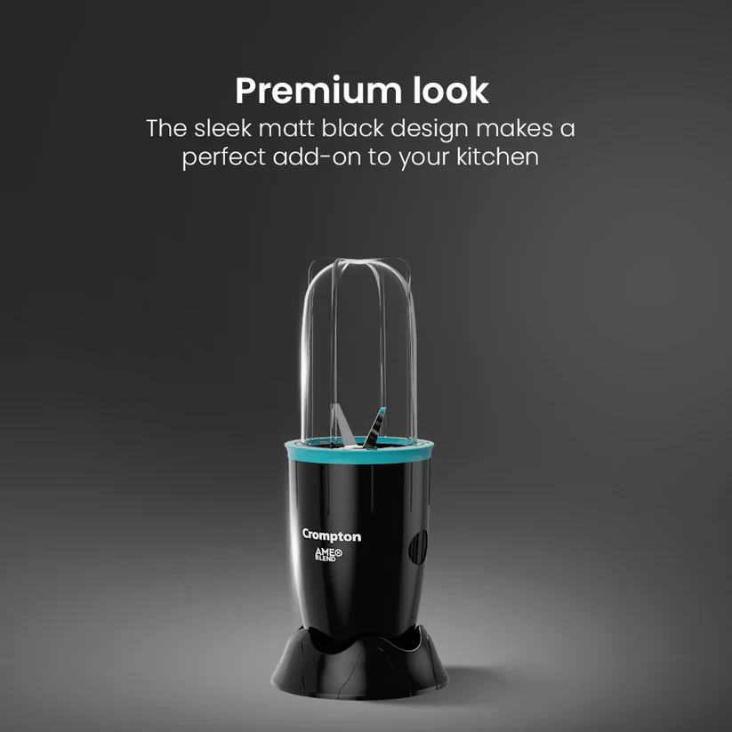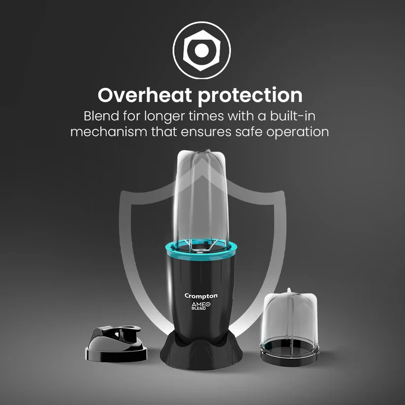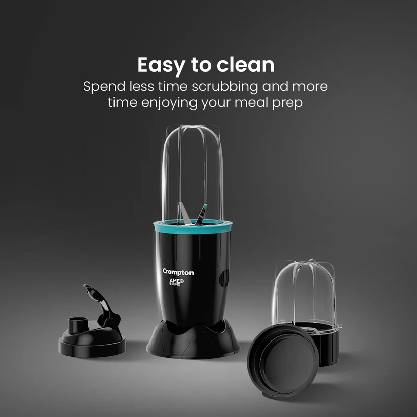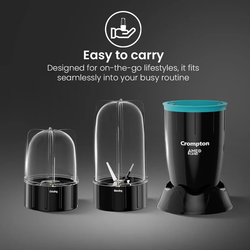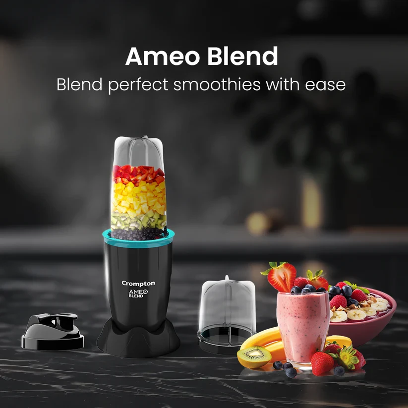 Discover the perfect balance of simplicity and performance with the Crompton Ameo Blend mixer. Its compact, portable design makes it easy to store and carry, allowing you to enjoy your favorite smoothies and shakes anytime, anywhere. The leak-proof jars ensure mess-free blending, giving you confidence with every use. Powered by a robust motor, it delivers smooth and consistent results, while the food-grade jars prioritize your health and well-being. The Crompton Ameo Blend transforms your kitchen experience, making blending quick, hassle-free, and enjoyable, empowering you to embrace a healthier lifestyle with ease and convenience.