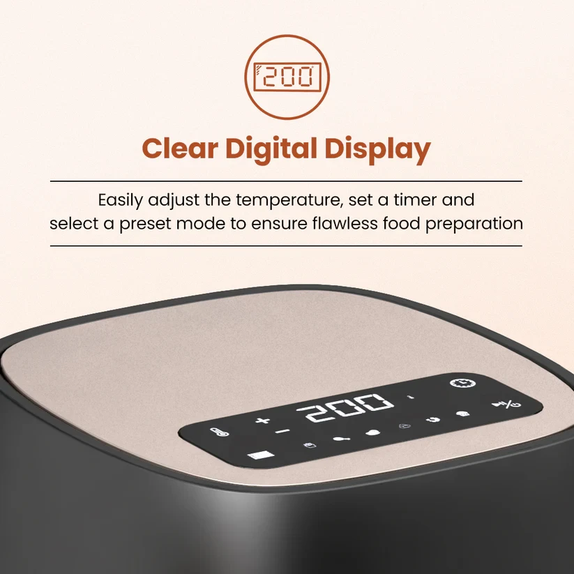 Enjoy your favourite fried dishes the healthier way with the Crompton Ameo DLX Air Fryer. Powered by Quick Fry Technology, it gives you evenly cooked, crispy results with up to 80% less oil. The digital display makes it easy to control temperature and set the 60-minute timer, while the 8 pre-programmed menus take the guesswork out of cooking everyday favourites. With a spacious capacity, it is perfect for family-sized portions, and the removable inner tray ensures effortless cleanup. Enjoy healthier, faster, and smarter cooking every day with the Crompton Ameo DLX Air Fryer.