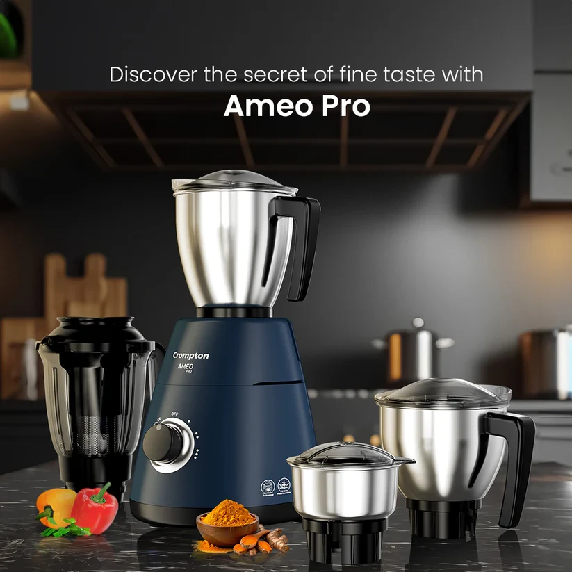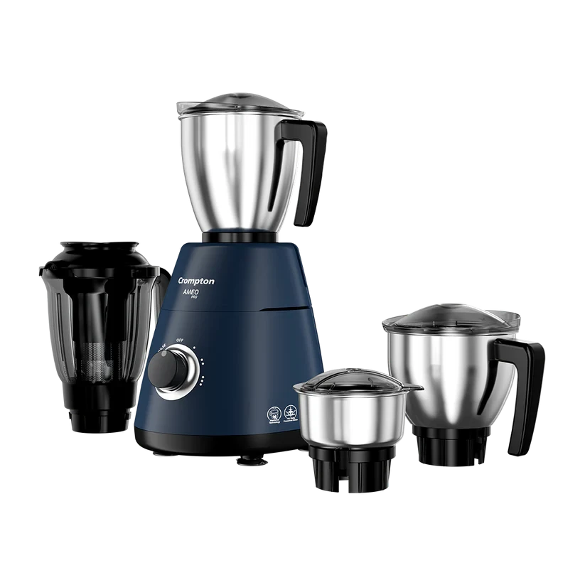 Introducing the Crompton Ameo Pro Motor Mixer Grinder, engineered with cutting-edge features for unparalleled performance. Crafted with durable stainless steel jars, it effortlessly handles various ingredients. Maxigrind Technology ensures precision grinding, delivering consistent results every time. The chrome-plated knob adds a touch of elegance while ensuring user-friendly operation. Engineered with Motor Vent X technology, it efficiently dissipates heat for prolonged motor life, ensuring durability and reliability. Elevate your culinary experience with the Ameo Pro, where innovation meets convenience for seamless blending and grinding.