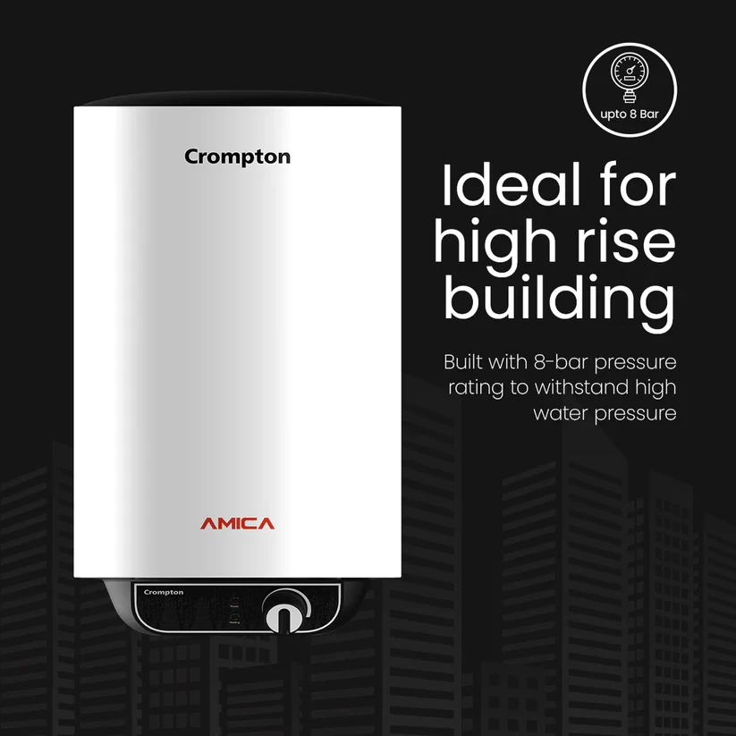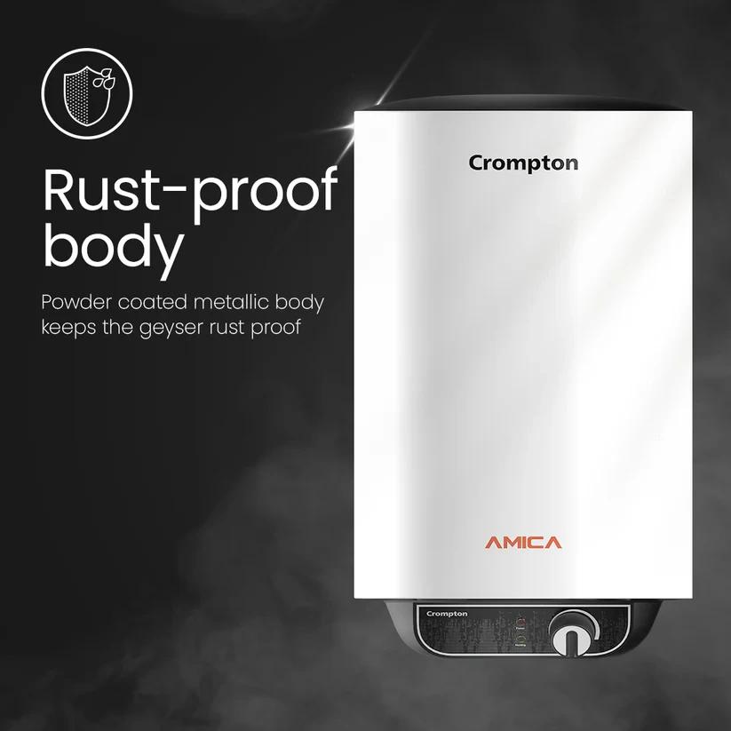 Do you want perfect hot water in just 10 minutes? Crompton’s Amica water heaters come to the rescue. Amica Classic water heaters show smart energy management, have advanced three level safety, and also come with a powerful heating element that can achieve 45°C in 10 minutes. They are designed with a stainless steel core and rust-free body to last for decades. The in-built nano poly bond technology offers outstanding corrosion and oxidation resistance to protect the inner tank from scaling and damage. These 5-star-rated geysers feature 8-bar pressure, making them perfect for high-rise buildings as they can withstand extreme water pressure without any load.