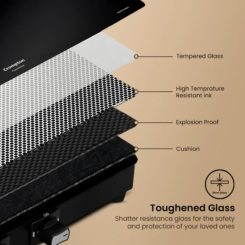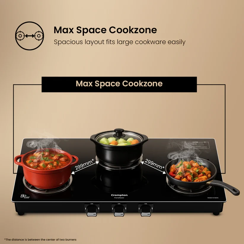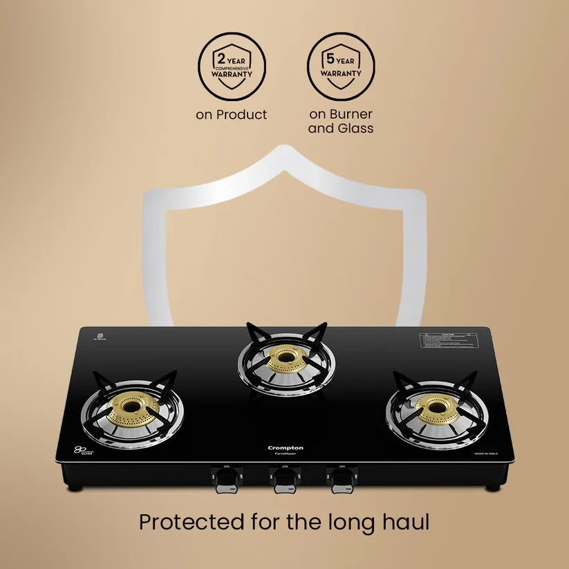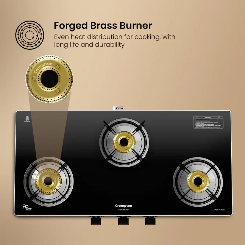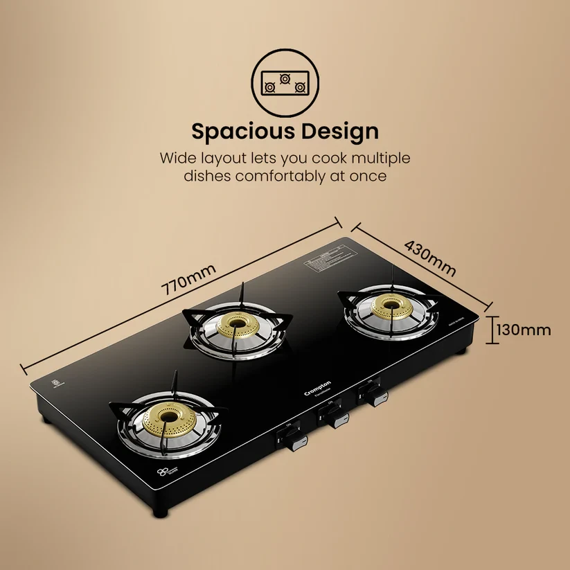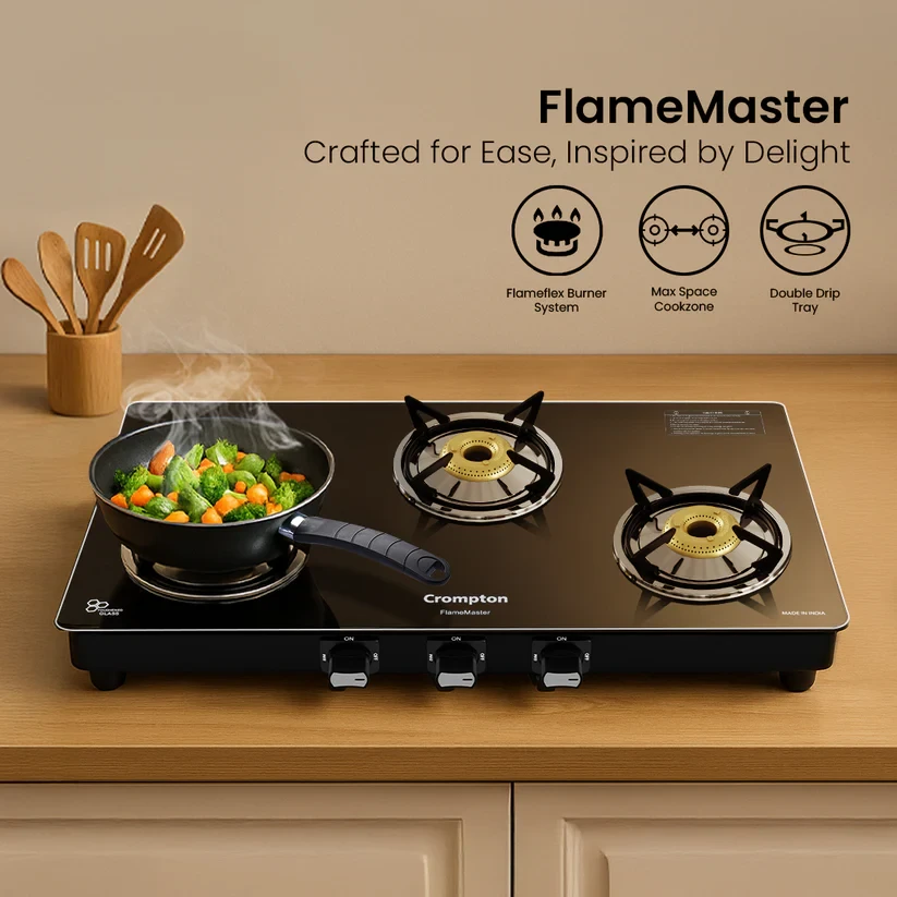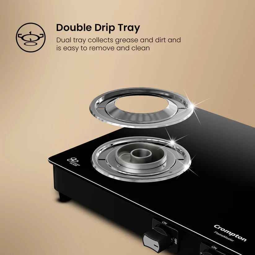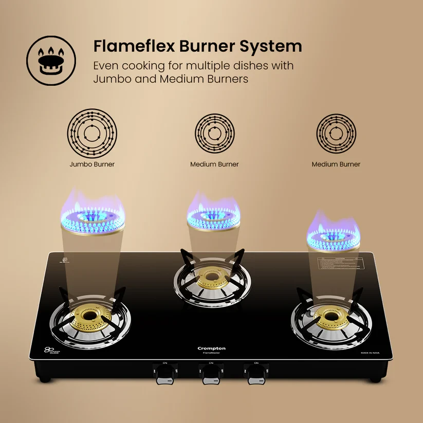 Experience unmatched versatility with the Crompton FlameMaster. The FlameFlex Burners are designed to cook multiple dishes evenly with a smart combination of jumbo and medium burners. The Max Space Cookzone gives you more room to work with, easily accommodating larger cookware without crowding. Enjoy effortless clean-ups with the Double Drip Tray- a top tray for quick cleaning and a bottom tray for added protection from spills. Built with durable Brass Burners, it ensures consistent heat and durability to ensure long life for every cooking style. The FlameMaster is where smart design meets everyday performance.