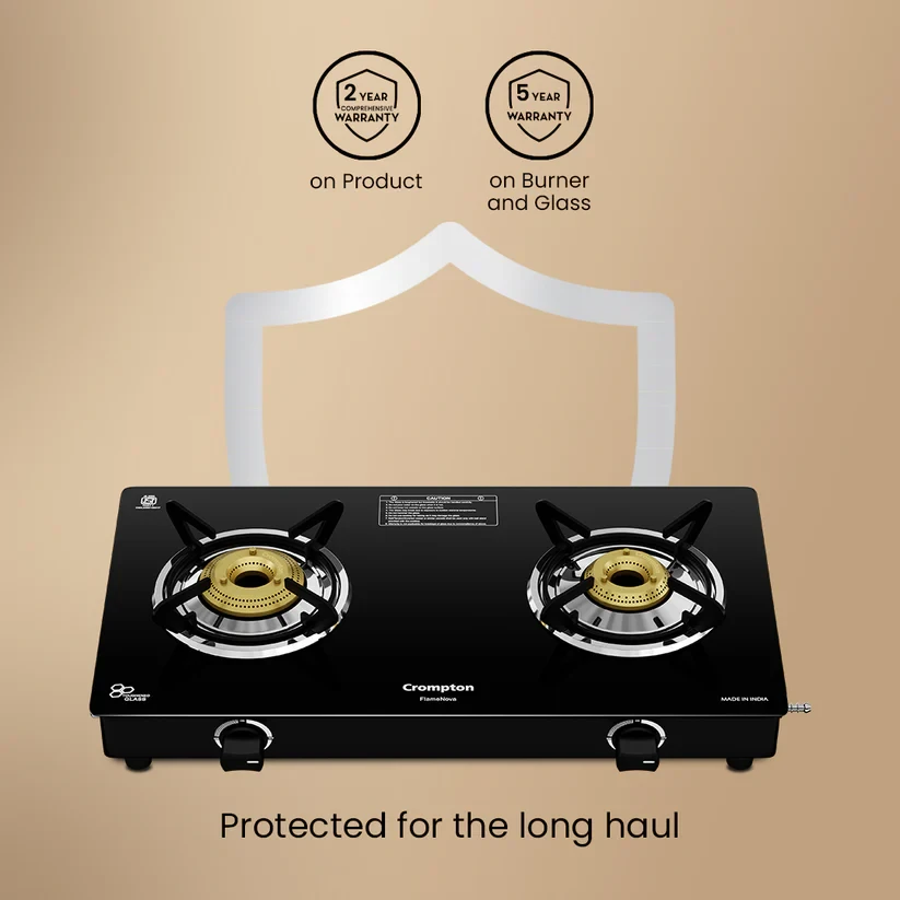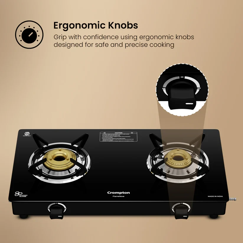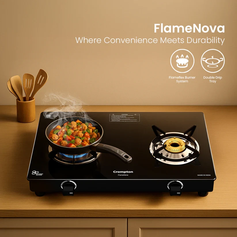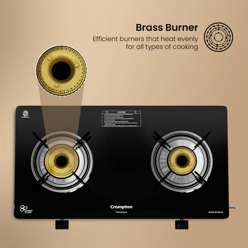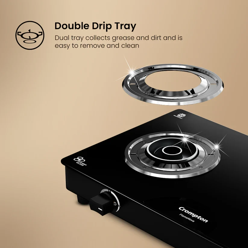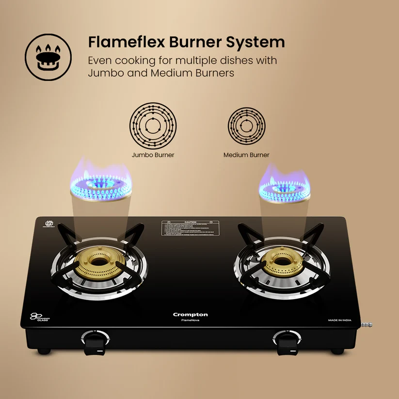 Enjoy the comfort of convenient cooking with the Crompton Flame Nova. It is designed for effortless multitasking and long-lasting performance. Featuring the innovative FlameFlex Burner, it combines jumbo and large burners to ensure even heat distribution across multiple dishes. The Double Drip Tray system provides top for quick cleanup and bottom for extra protection - spills are no longer a hassle. Durable brass burners offer reliable, corrosion-resistant performance, while Glass Protect technology safeguards the hob from heat damage and enhances flame efficiency, keeping your kitchen both stylish and functional. Cook more, clean less, and enjoy every step with the Flame Nova.