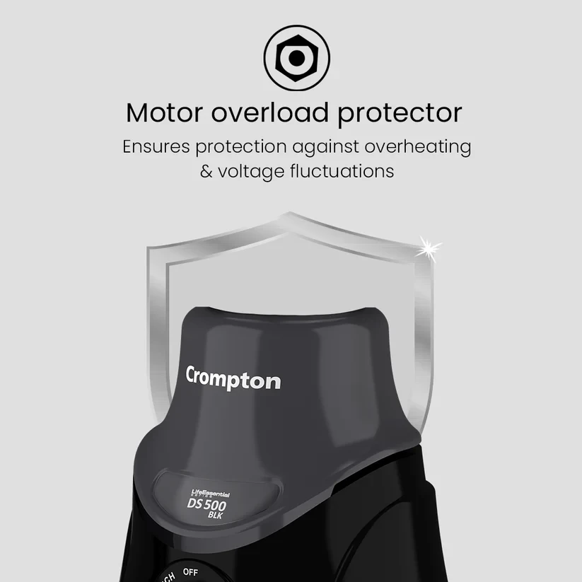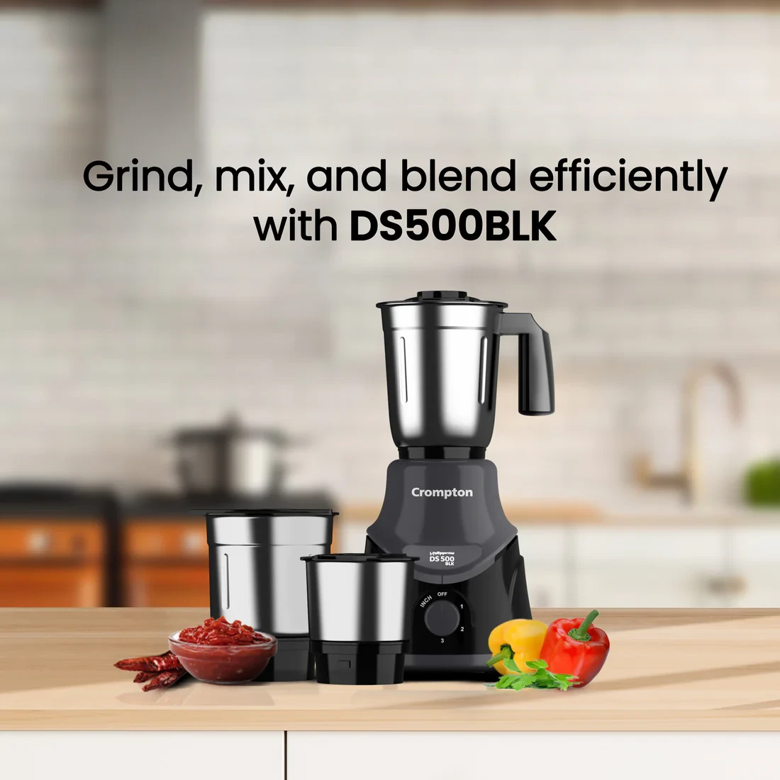 For an outstanding gridning experience get the Crompton DS 500 Mixer Grinder that grinds heavy duty items with ease. The Mixer Grinder that enhances your kitchen comes with Motor Vent-X Technology to ensure better air circulation & motor ventilation, generating less heat for longer motor life. Get ready to whip up tasty smoothies, finely ground masalas, tangy chutneys, chopped vegetables, and much more in a flash. Your safety and comfort is our priority which is why the grinder is secured with overload protection & 3x speed in-built pulse switch. The product also comes with three corrosion & leakage-free Stainless Steel jars.