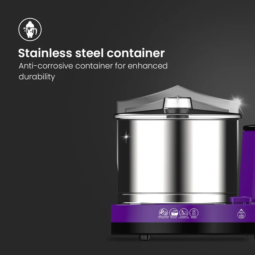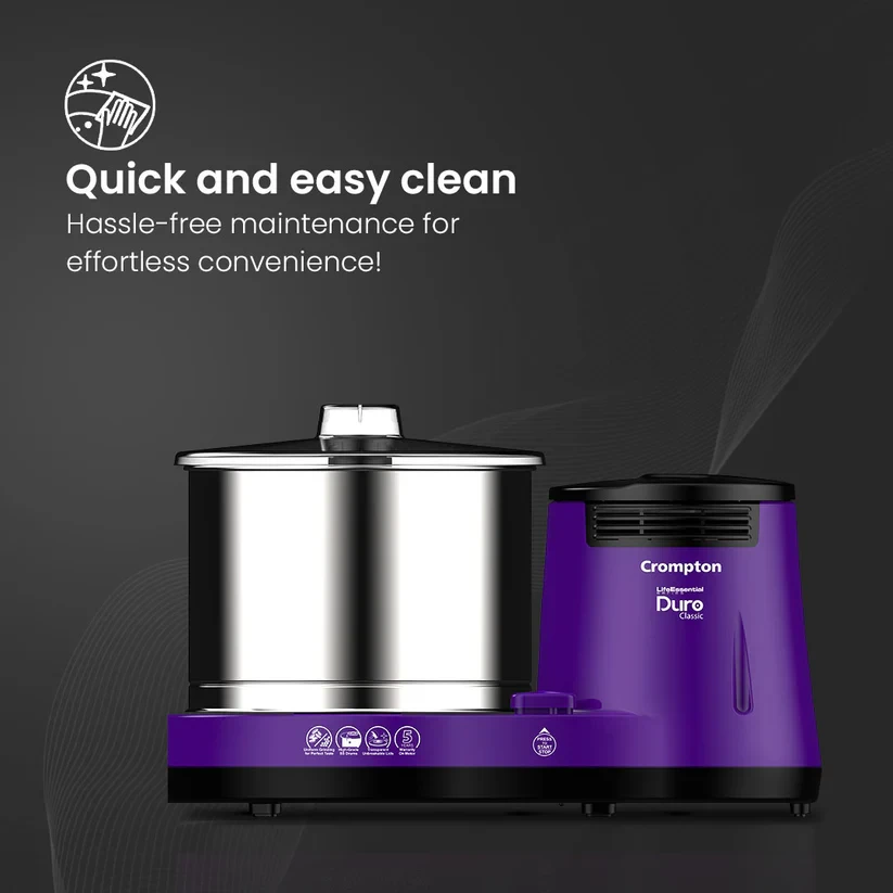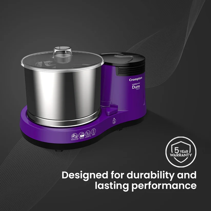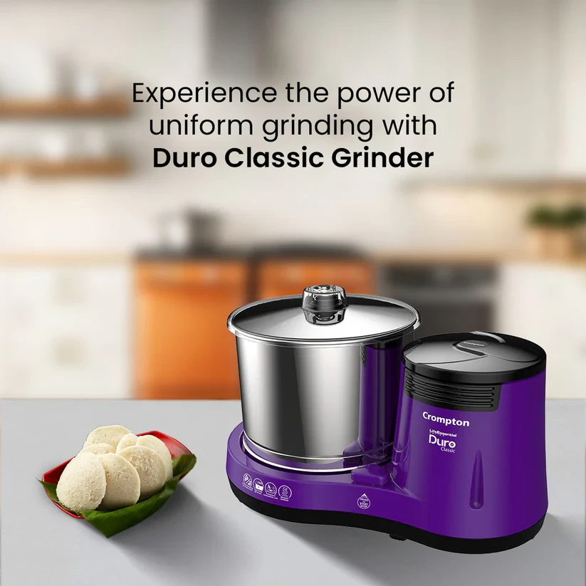 Meet Crompton Duro Classic Wet Grinder - your trusted kitchen companion! As you may know, the smoother & softer the batter, the better the dish, and the cylindrical stones of the Duro Classic ensure that all the ingredients blend perfectly and the final product is a treat for your taste buds. To top it off, you can enjoy your delicacies with complete peace of mind because of the 5-year warranty on the motor. Get home a Crompton Duro Classic Wet Grinder now.