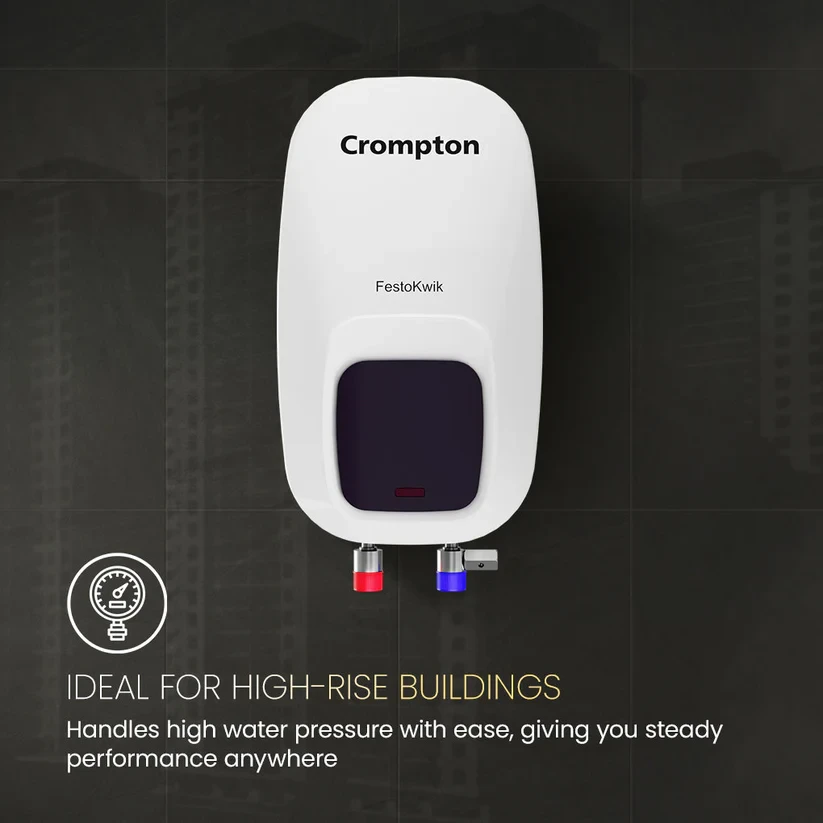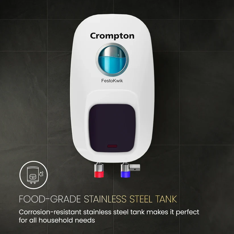 The Crompton FestoKwik is designed for quick heating and everyday convenience. Powered by a strong 3 kW heating element, it delivers hot water fast, making it ideal for busy mornings. The food-grade stainless steel tank ensures safe, clean water and long-lasting performance. Built to handle up to 6 bar pressure, it works well in high-rise homes too. Advanced 3-level safety protection adds reliability, while the rust-proof plastic body keeps the heater durable over time. Compact and versatile, FestoKwik offers a simple, efficient, and dependable hot water solution for daily needs.
