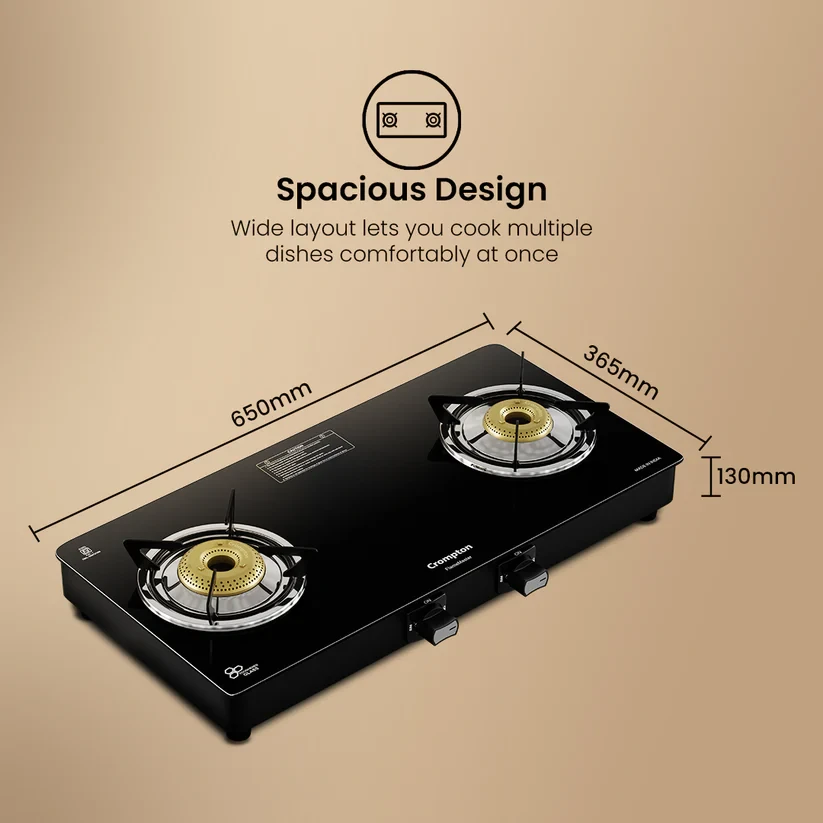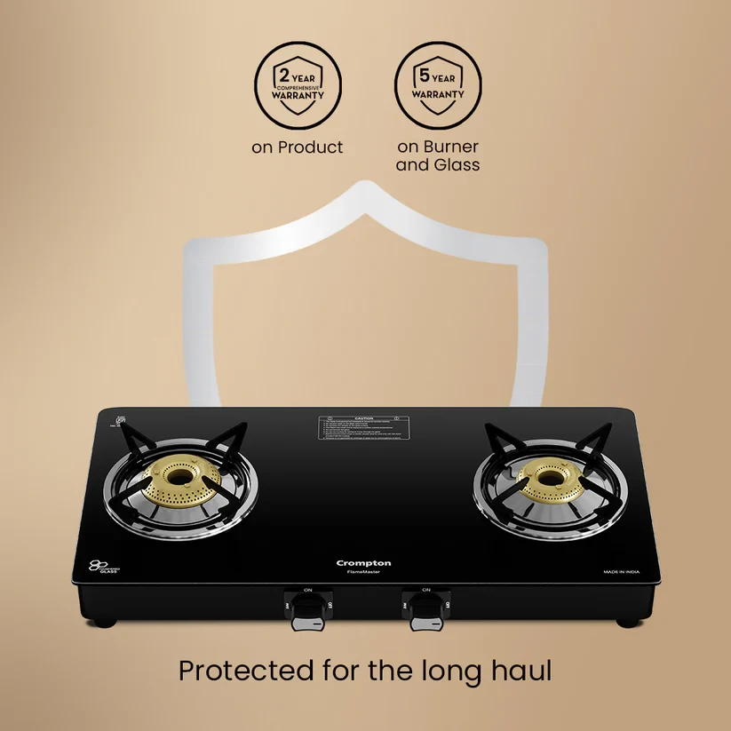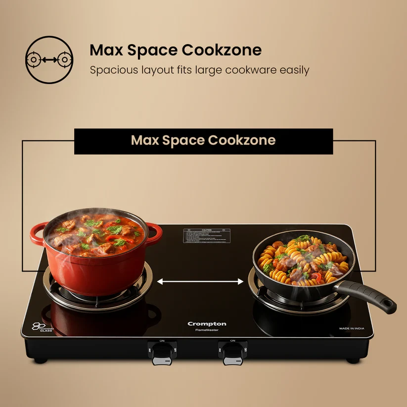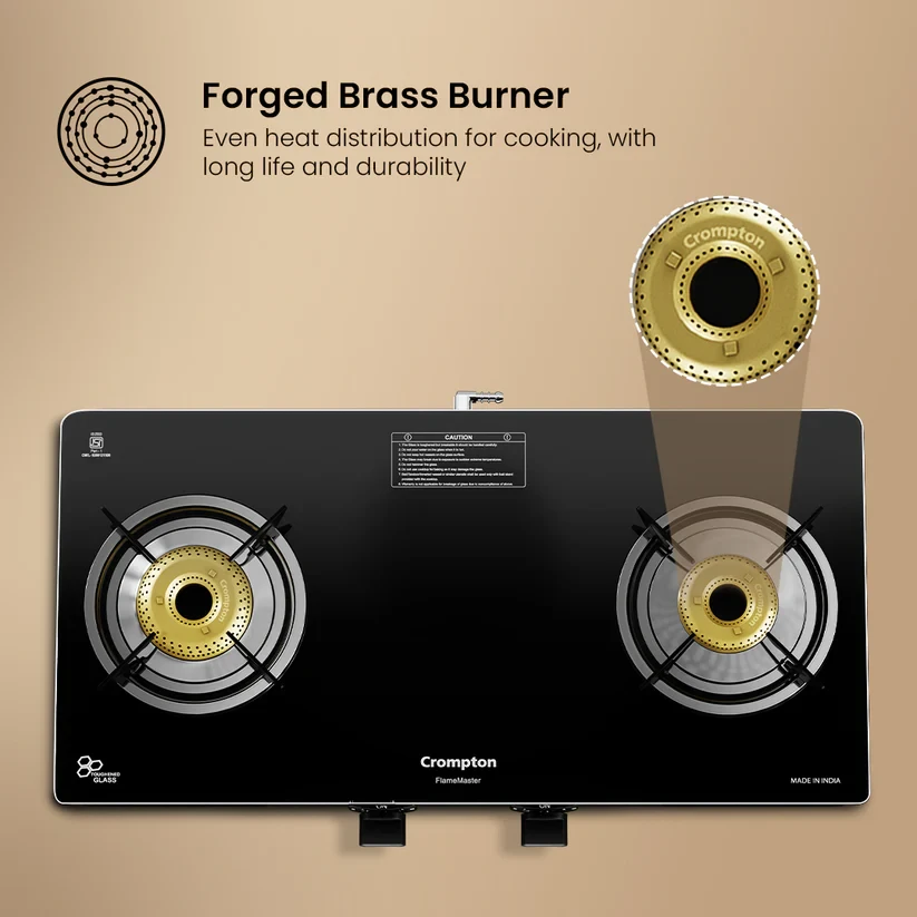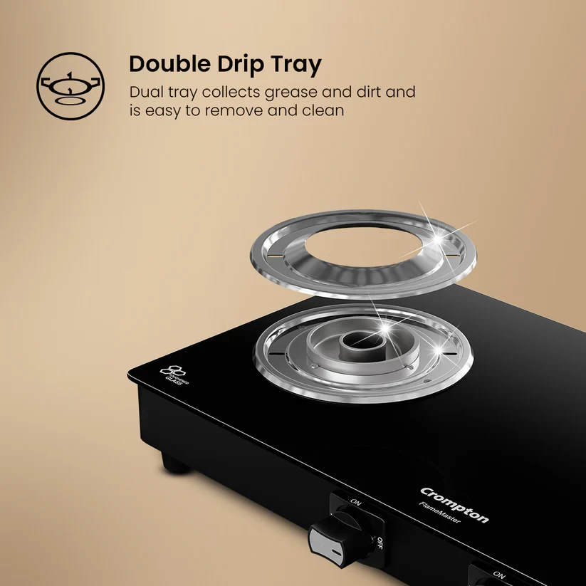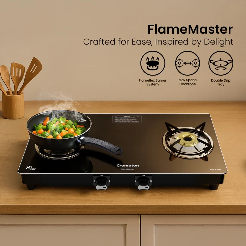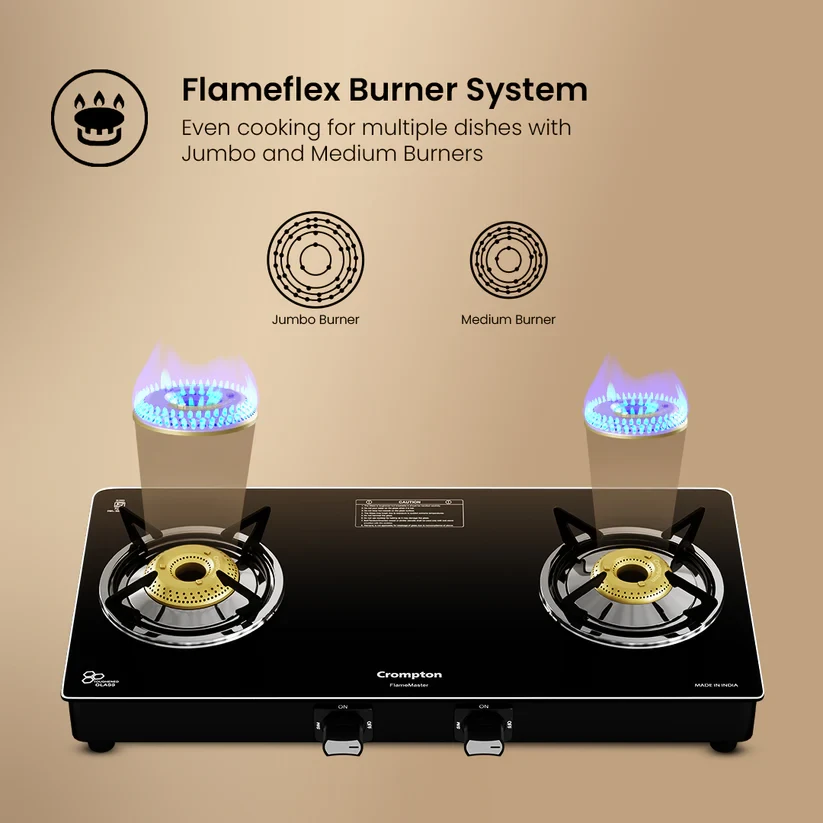 Experience unmatched versatility with the Crompton FlameMaster. The FlameFlex Burners are designed to cook multiple dishes evenly with a smart combination of jumbo and medium burners. The Max Space Cookzone gives you more room to work with, easily accommodating larger cookware without crowding. Enjoy effortless clean-ups with the Double Drip Tray- a top tray for quick cleaning and a bottom tray for added protection from spills. Built with durable Brass Burners, it ensures consistent heat and durability to ensure long life for every cooking style. The FlameMaster is where smart design meets everyday performance.