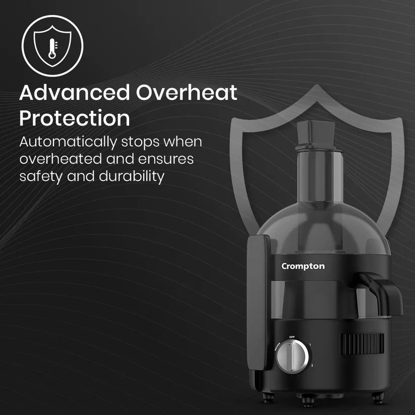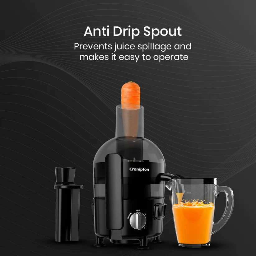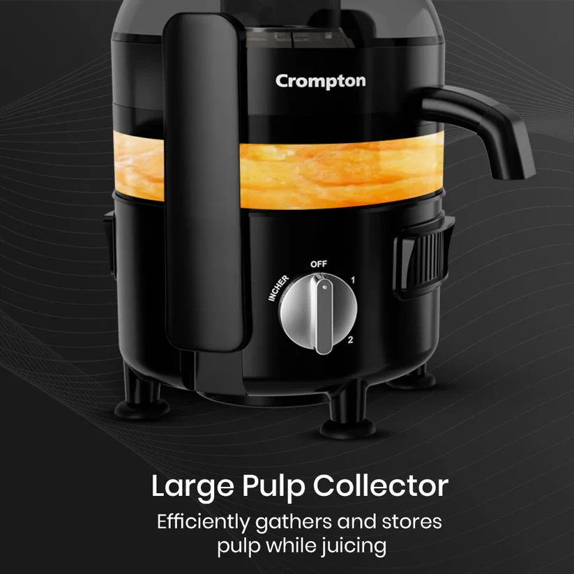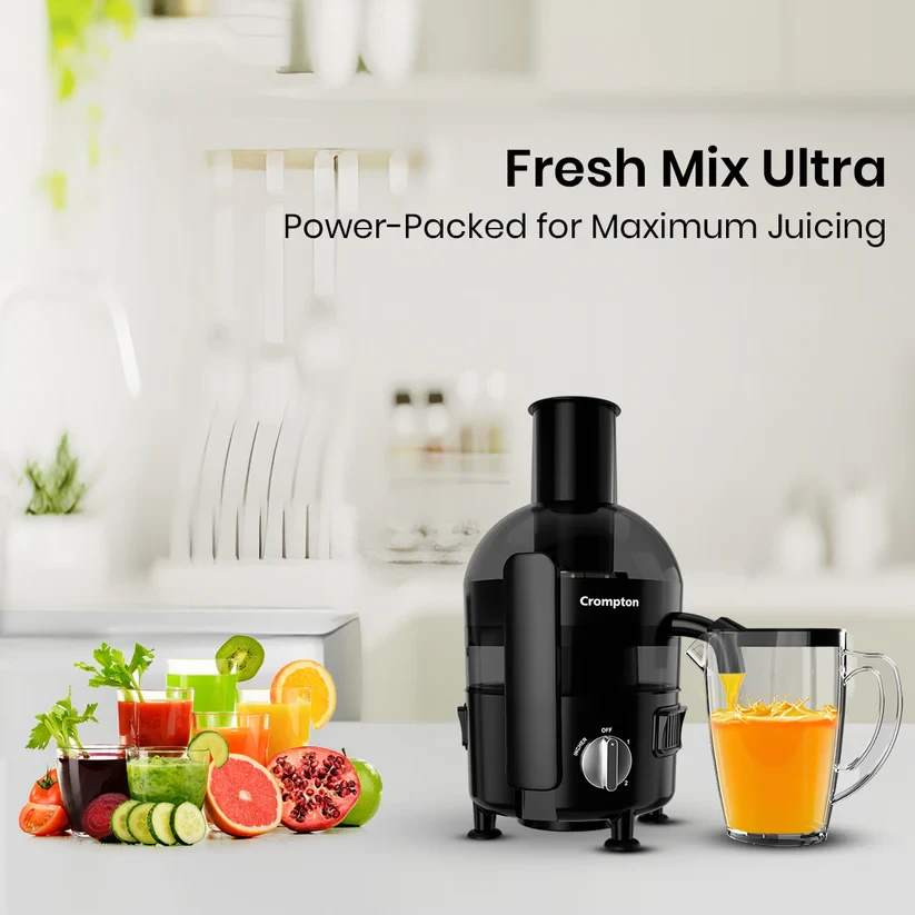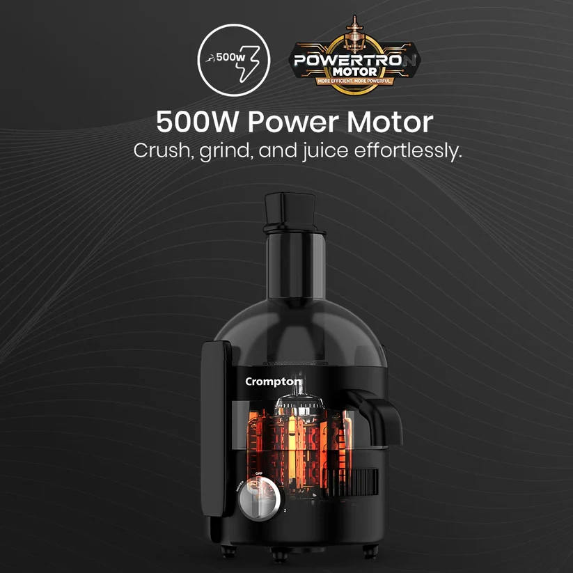 Experience effortless juicing with the Crompton Fresh Mix Ultra It is powered by a 500W PowerTRON Motor for smooth crushing, grinding, and juicing. Designed for efficiency, it features dual juicing modes - low speed for fruits and high speed for vegetables - ensuring maximum juice extraction. The anti-drip spout prevents spills for a mess-free experience, while the large pulp collector neatly stores pulp. With multiple attachments, including dedicated pushers for fruits and vegetables and a juice collector jar, enjoy can enjoy fresh and hassle-free juicing every day!
