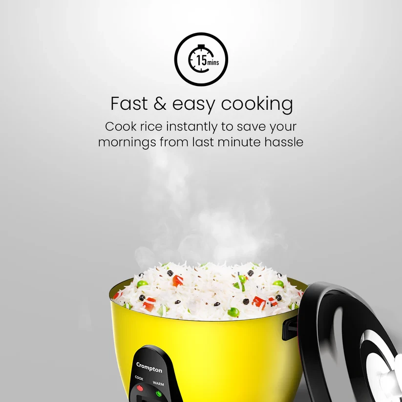 The Crompton Harvest Pro Rice Cooker offers expeditious and efficient rice preparation, achieving the task within a mere 15 minutes. Its food-grade non-stick coating facilitates effortless cleaning, and the dual indicators provide clear notifications for cooking and warming phases. Not only that, the incorporation of cool-touch handles prioritizes safety during handling. Additionally, the dual cook mode enhances versatility, accommodating various rice types with precision. Elevate your culinary practices with the Crompton Harvest Pro Lite.