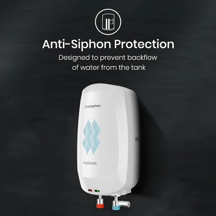 Embrace instant warmth with the Crompton HydraJet Water Heater, designed for quick heating and the luxury of hot water on demand. Whether it’s a refreshing morning shower or a soothing soak after a long day, this water heater provides perfect temperature control whenever you need it. With a 4-level safety system, your peace of mind is guaranteed, allowing you to relax without a second thought. Crafted for durability, its rustproof body ensures long-lasting performance and a sleek appearance for years to come. Combining style, reliability, and functionality, the Crompton HydraJet Water Heater simplifies your daily routine, offering a hassle-free and enjoyable experience.