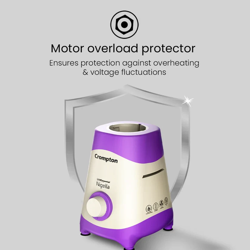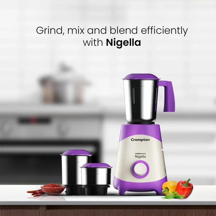 For an outstanding gridning experience get the Crompton Nigella Mixer Grinder that grinds heavy duty items with ease. The Mixer Grinder that enhances your kitchen comes with Motor Vent-X Technology to ensure better air circulation & motor ventilation, generating less heat for longer motor life. Get ready to whip up tasty smoothies, finely ground masalas, tangy chutneys, chopped vegetables, and much more in a flash. Your safety and comfort is our priority which is why the grinder is secured with overload protection & 3x speed in-built pulse switch. The product also comes with three corrosion & leakage-free Stainless Steel jars.