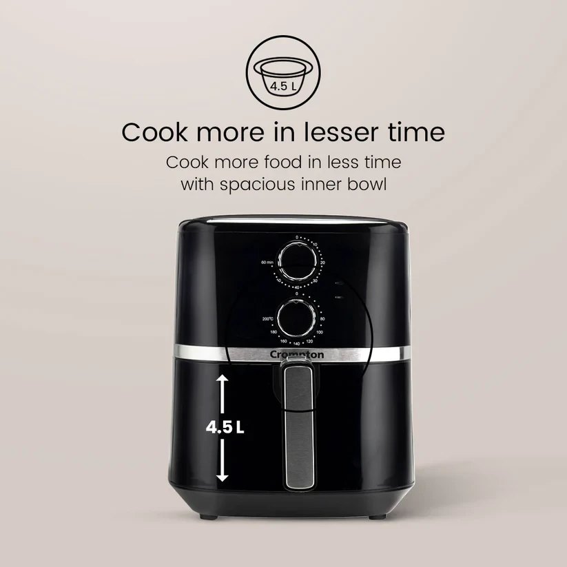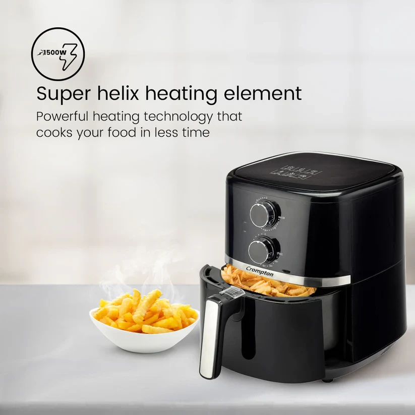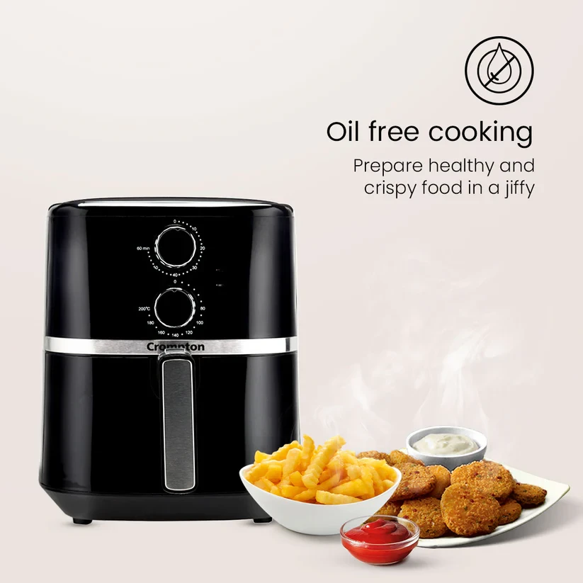 Crompton NourisPro Air Fryer Range with Quick Fry Technology helps to prepare Guilt Free Food in No Time. Its Superior Super Helix Heating elemnt and Jet Turbo fins are specifically designed to heat the food quickly while retaining the texture and taste. The Large Circular Inner Bowl helps to prepare more food in one go. NourisPro Range also comes with Additional accessories - OIl Brush & Tongs adding more utility to the product. Recipe Book curated by Baking academy conssiste of 20 Lip Smacking Recipes.
