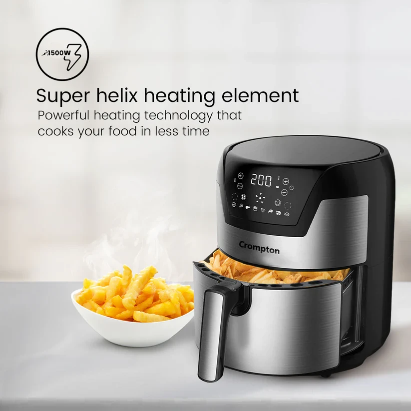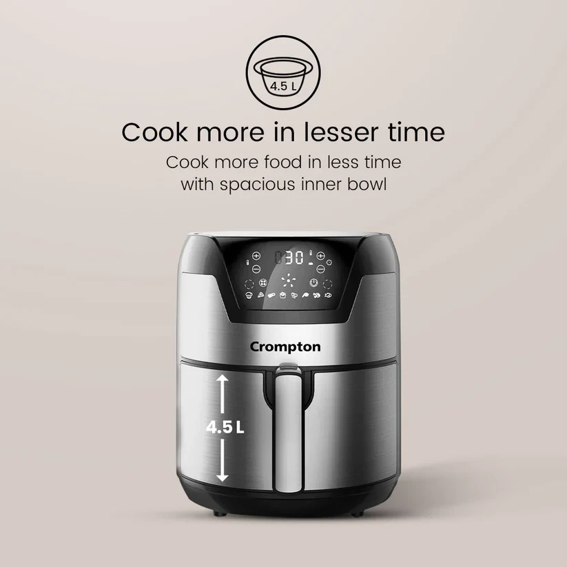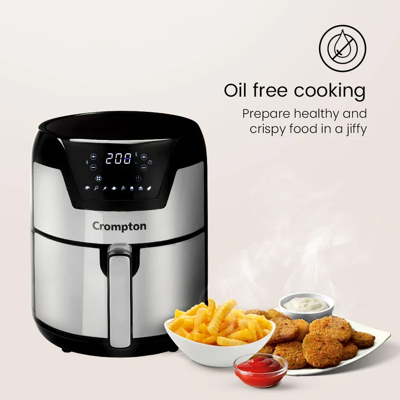 Crompton NourisPro Air Fryer Range with Quick Fry Technology helps to prepare Guilt Free Food in No Time. Its Superior Super Helix Heating elemnt and Jet Turbo fins are specifically designed to heat the food quickly while retaining the texture and taste. The Large Circular Inner Bowl helps to prepare more food in one go. NourisPro Range also comes with Additional accessories - OIl Brush & Tongs adding more utility to the product. Recipe Book curated by Baking academy conssiste of 20 Lip Smacking Recipes.
