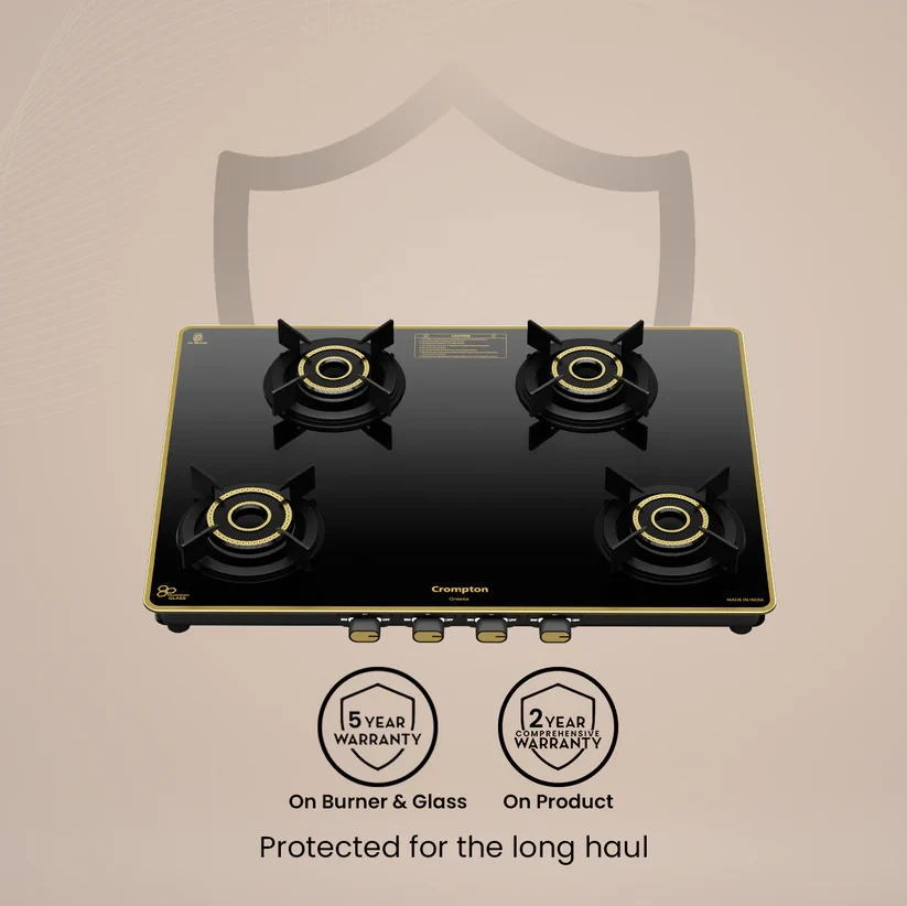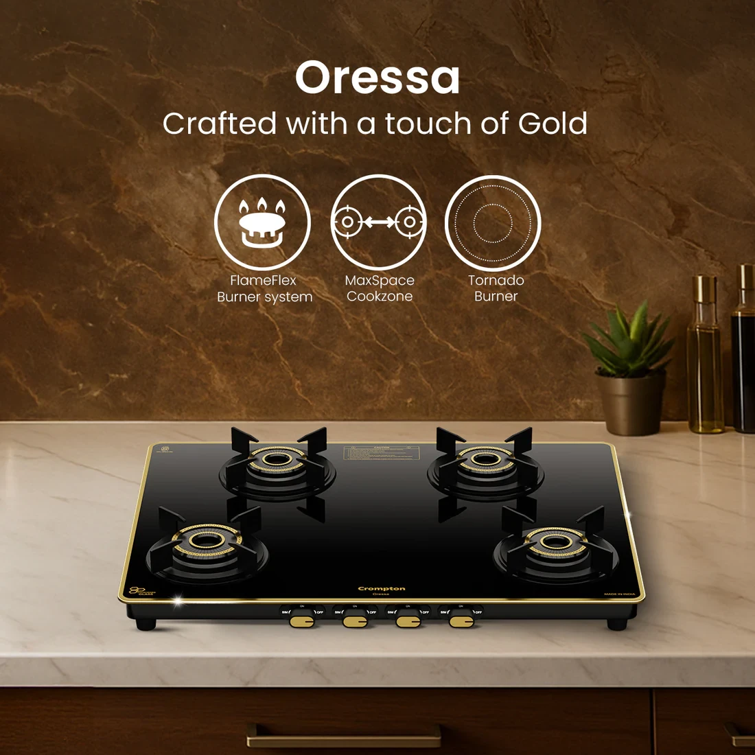 Make every meal easier with the Crompton Oressa Cooktop, designed to give you more power, more space, and more convenience. Its FlameFlex Burner System combines different burner sizes so you can cook multiple dishes evenly. Its hybrid design allows it to be used both as a hob and a cooktop, giving you flexibility to match your kitchen setup. The MaxSpace Cookzone and spacious design let you place large cookware side by side without hassle, while the Tornado Brass Burners deliver steady heat for faster and more efficient cooking. Built with toughened glass, it adds both durability and a sleek, modern look to your kitchen. With the Oressa cooktop, you cook smarter, safer, and with the space you’ve always wanted.