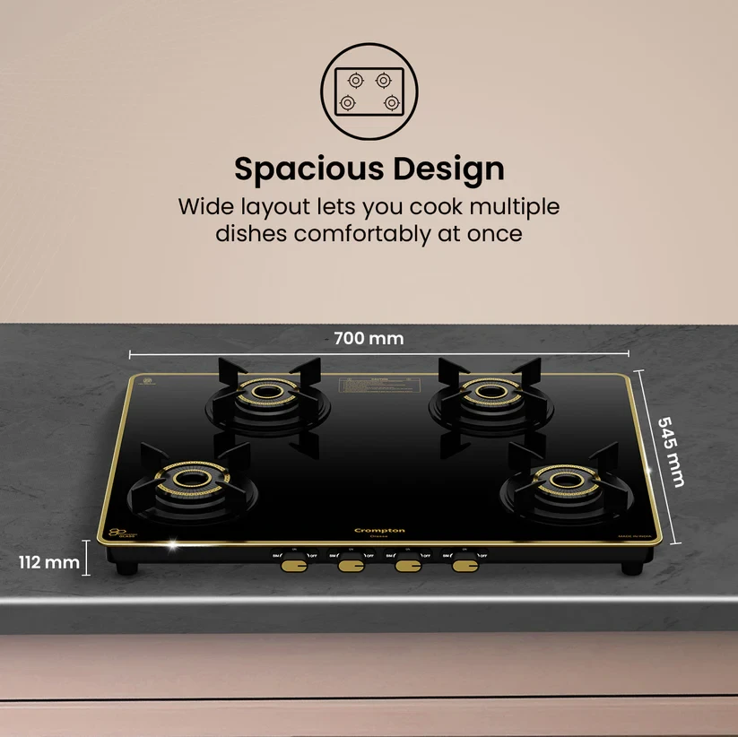 | Model Name | Crompton Oressa 4 Burner 70 cm Slim Glass Cooktop |