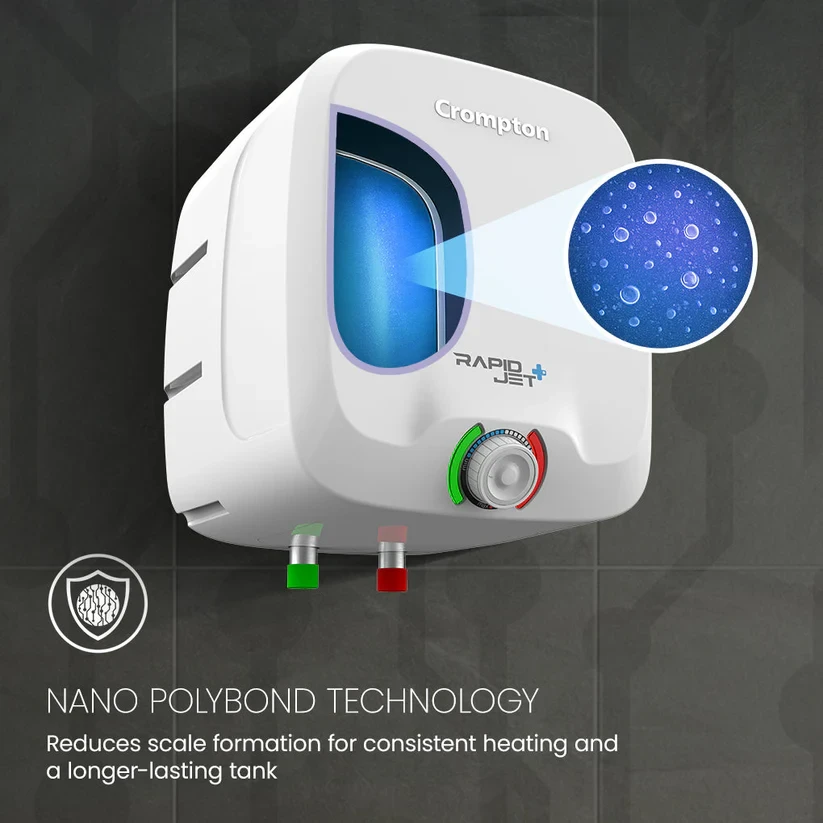 The Crompton RapidJet Plus is a reliable water heater for daily heavy use. Built to handle water quality up to 2000 ppm, its anti-scale technology helps reduce deposits and keeps heating efficient for longer. The Nano Polybond tank coating and Smart Shield corrosion protection work together to protect the tank from rust and wear. The 8-bar pressure support makes it a great choice for high-rise buildings. A temperature control knob gives you easy control, and the rust-proof plastic body is designed to last in humid bathrooms. Built for everyday comfort, the RapidJet Plus is a dependable hot water solution.