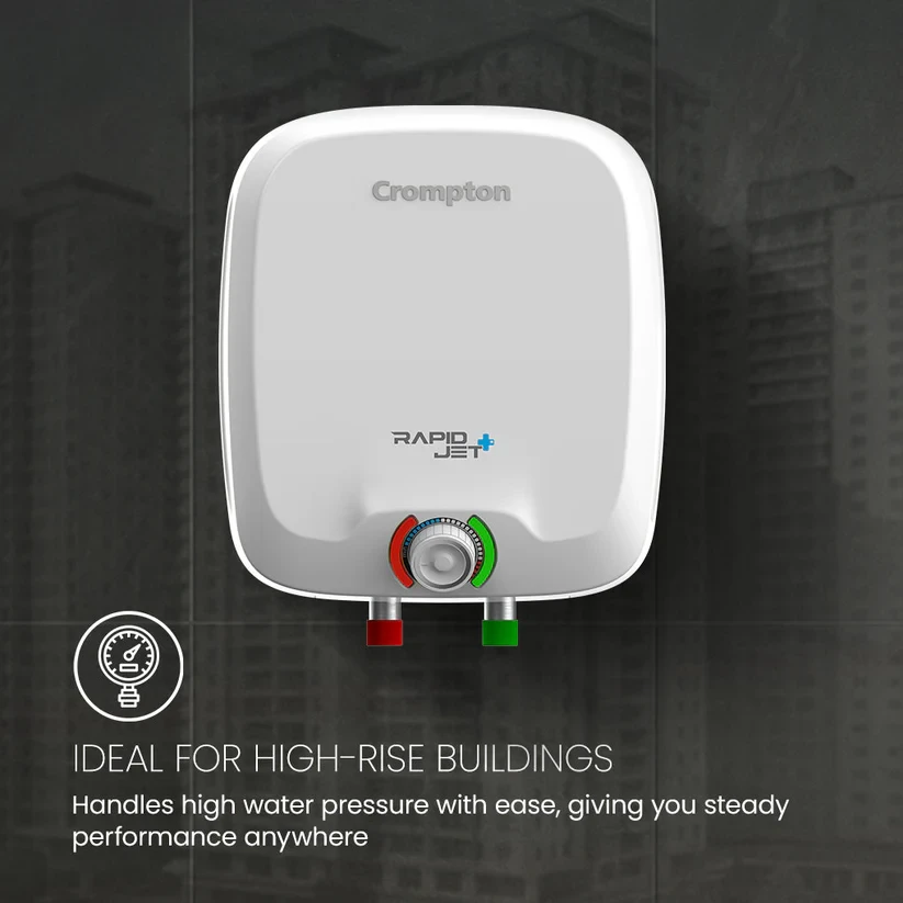 The Crompton RapidJet Plus is a reliable water heater for daily heavy use. Built to handle water quality up to 2000 ppm, its anti-scale technology helps reduce deposits and keeps heating efficient for longer. The Nano Polybond tank coating and Smart Shield corrosion protection work together to protect the tank from rust and wear. The 8-bar pressure support makes it a great choice for high-rise buildings. A temperature control knob gives you easy control, and the rust-proof plastic body is designed to last in humid bathrooms. Built for everyday comfort, the RapidJet Plus is a dependable hot water solution.