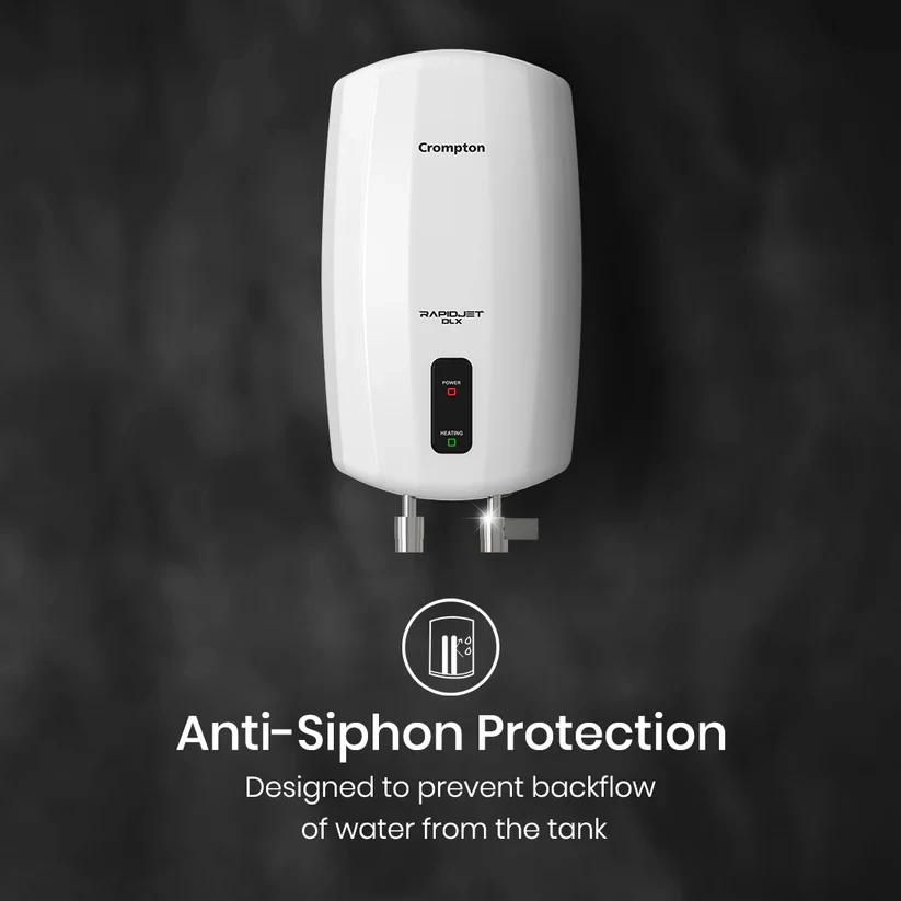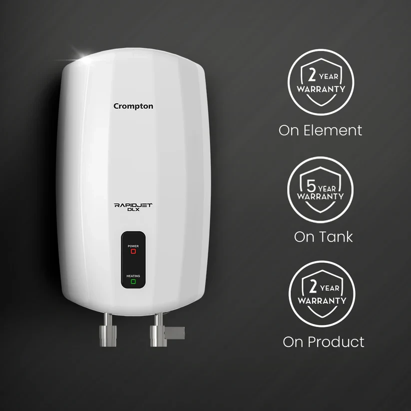 Experience a new level of comfort and convenience with the Crompton RapidJet DLX Water Heater. Thanks to its powerful heating element, it ensures you have hot water on demand, so you can enjoy a revitalizing shower exactly when you need it, without the long wait. Its rust-proof body not only adds a sleek and modern touch to your space but is also designed to withstand the test of time, maintaining its quality and aesthetic for years to come. With its advanced 4-level safety features, you can stay worry-free knowing that loved ones are protected. Designed for those who appreciate simplicity and effectiveness, the RapidJet DLX enhances your daily rituals, making each moment feel like a little luxury in your busy life.