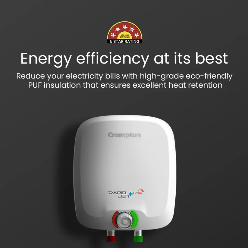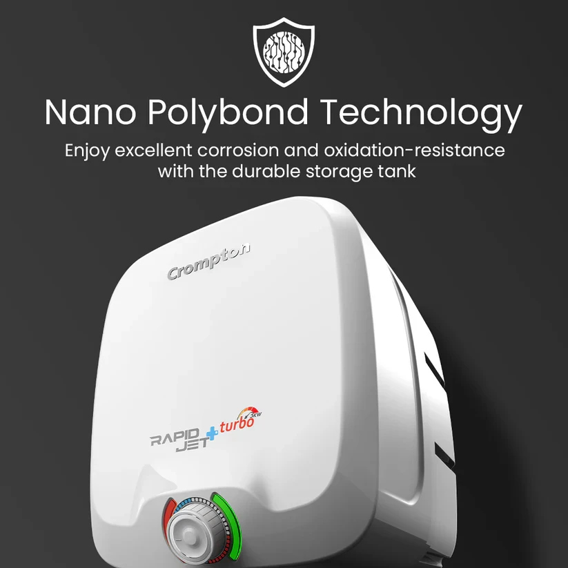 When it's in the name, you can rely on it to instantly provide perfect hot water. Crompton’s Rapid Jet water heaters are aesthetically appealing and performs to please one and all. Their bodies is designed to withstand water pressure and intense heat; therefore, its durability is unquestionable. A consistently delightful experience is guaranteed thanks to the stainless steel tank's reduced risk of leakage and the ISI-marked nickel-coated copper heating element prevention of scale formation. Additionally, these Crompton instant heaters include a capillary thermostat, an automatic thermal cut-off, a pressure release valve, and a fusible plug that provides 4 levels of safety.