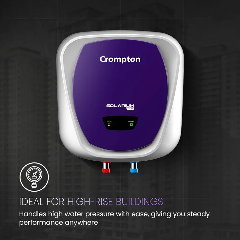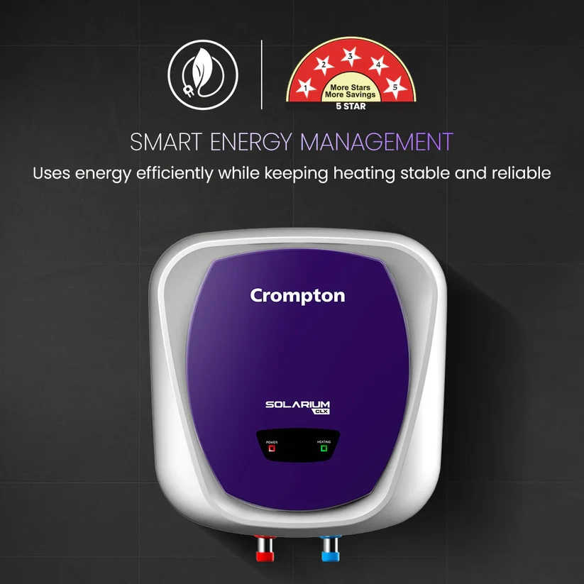Imagine starting your day with a refreshing hot shower that instantly energizes you, thanks to Crompton's Solarium CLX Storage Water Heater. Whether it's a chilly winter morning or you just need to unwind after a long day, the Solarium CLX ensures you have hot water at your fingertips, all year round. This state-of-the-art water heater offers energy efficiency, rapid heating with a 2000W element, and a higher storage capacity, making it the perfect addition to your home. Enhanced with Nano Polybond technology and a durable glass lined coated tank, it resists corrosion and scale formation. With additional benefits like hard water protection, universal fitment, and zero leakage, the Solarium CLX is the perfect blend of style, safety, and reliability for your home.