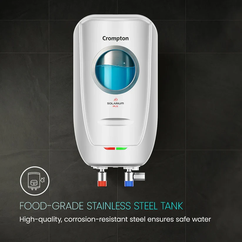 The Crompton Solarium PLS is built for everyday comfort. Its powerful 3 kW heating element heats water quickly. Designed to handle hard water, the anti-scale technology helps reduce buildup and keeps performance steady over time. Safety is taken care of with advanced 3-level protection, giving you peace of mind. The rust-proof plastic body and food-grade stainless steel tank add durability, while the LED indicator lets you know when the water is ready. Compact and versatile, the Solarium PLS is a reliable choice for homes that need fast heating, safety, and long-lasting performance in one simple water heater.