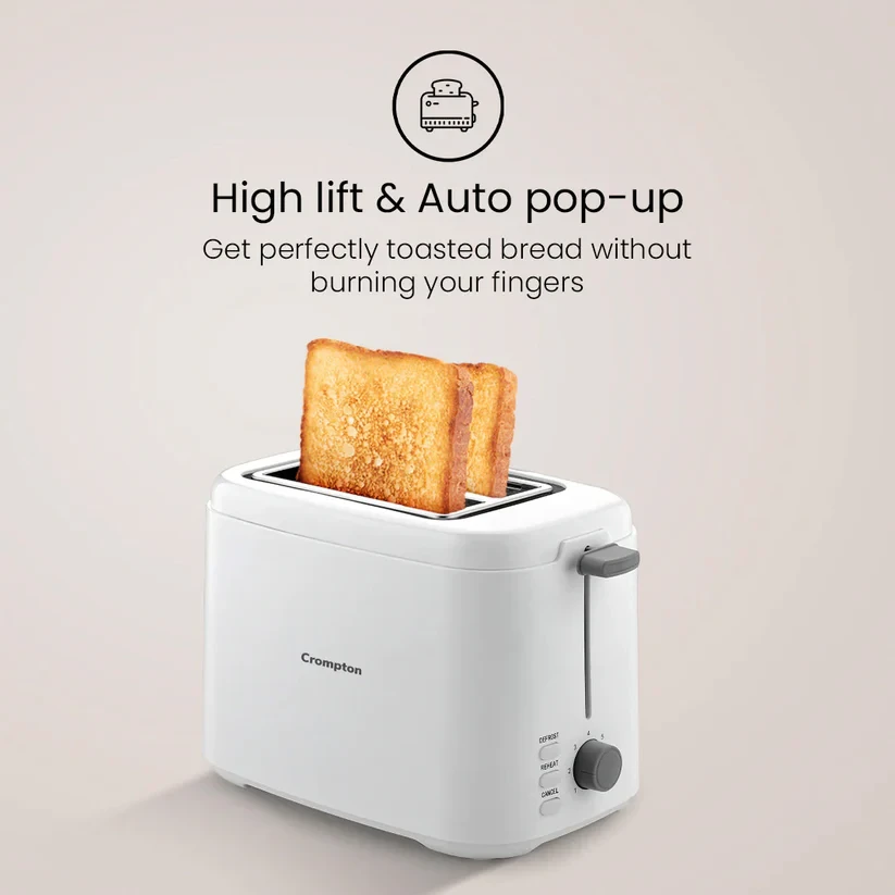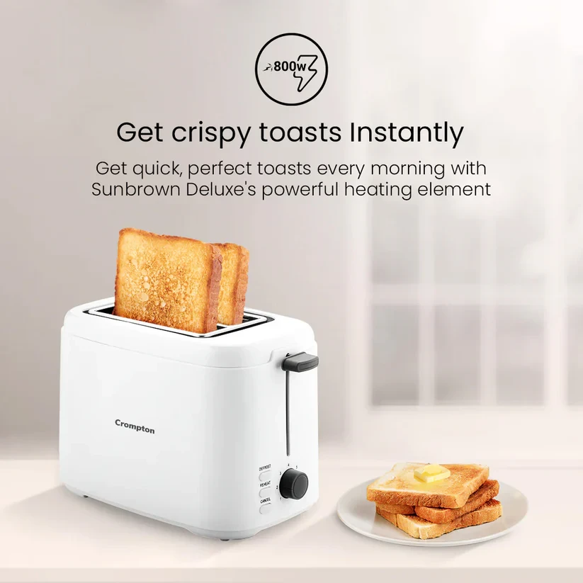 Crompton's SunBrown Deluxe pop-up toaster comes with 7 level browning control that guarantees crispy bread within 2 minutes with the desired amount of charring. Thanks to the Auto Bread Centering technology, bread is toasted uniformly and quickly. You can accommodate thicker slices of bread in its 38mm wide bread slots. With multi-functional buttons that help to reheat, defrost, and cancel operations, SunBrown Deluxe pop-up toaster is compact in design and comes with an aesthetically attractive cool touch body. This toaster also comes with a removable crumb tray and dust cover plate that help keep the product clean.