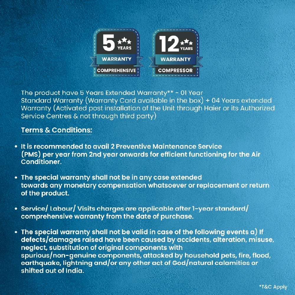 3. 5 years on the product and 12 years on the compressor (1-year warranty card in the box + 4-year promotional warranty activated post-installation). Installation by Haier/authorized centers & 2 maintenance services (paid) yearly is mandatory. T&C apply; exc