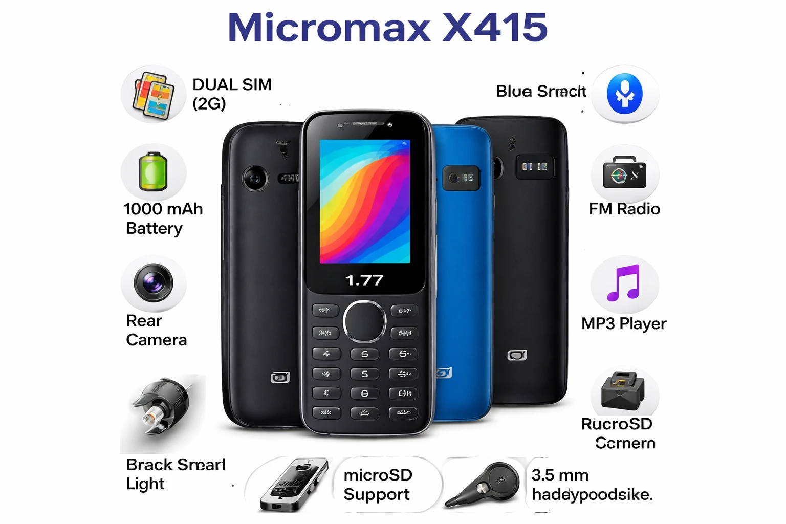 The Micromax X415 is a basic dual-SIM keypad feature phone ideal for calls, messaging, and essential mobile functions. It sports a 1.77-inch TFT display with 128×160 pixel resolution for clear visibility. The phone runs on a simple platform with 32 MB internal memory and supports microSD expansion up to ~8 GB for extra storage. Power comes from a 1000 mAh removable battery offering long standby and talk time. X415 includes a 0.3 MP rear camera to capture quick snaps. It also features FM radio, Bluetooth, MP3 music player, and basic tools like alarm and calculator. Connectivity includes 2G GSM, Bluetooth, microUSB, and a 3.5 mm headphone jack. Lightweight and easy to use, it’s suited for users needing a basic affordable phone without smartphone complexity.