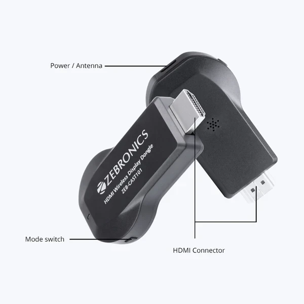 ZEB-CAST101 wireless HDMI dongle is a compact device which allows streaming full HD video and high-quality sound content from your mobile device, tablet, laptop to TV/Projectors effortlessly. The device is compatible with Android, Windows and iOS devices. This media streaming dongle -plugged in to the HDMI Port of your TV will stream Photos, Videos, Music on your TV.