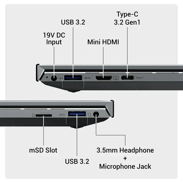 | USB3.2 x 2 | Type C port | mSD slot | 3.5mm HP | Mini HDMI | |