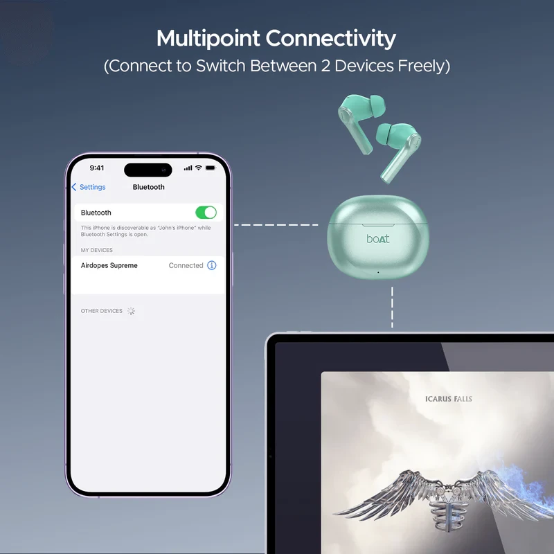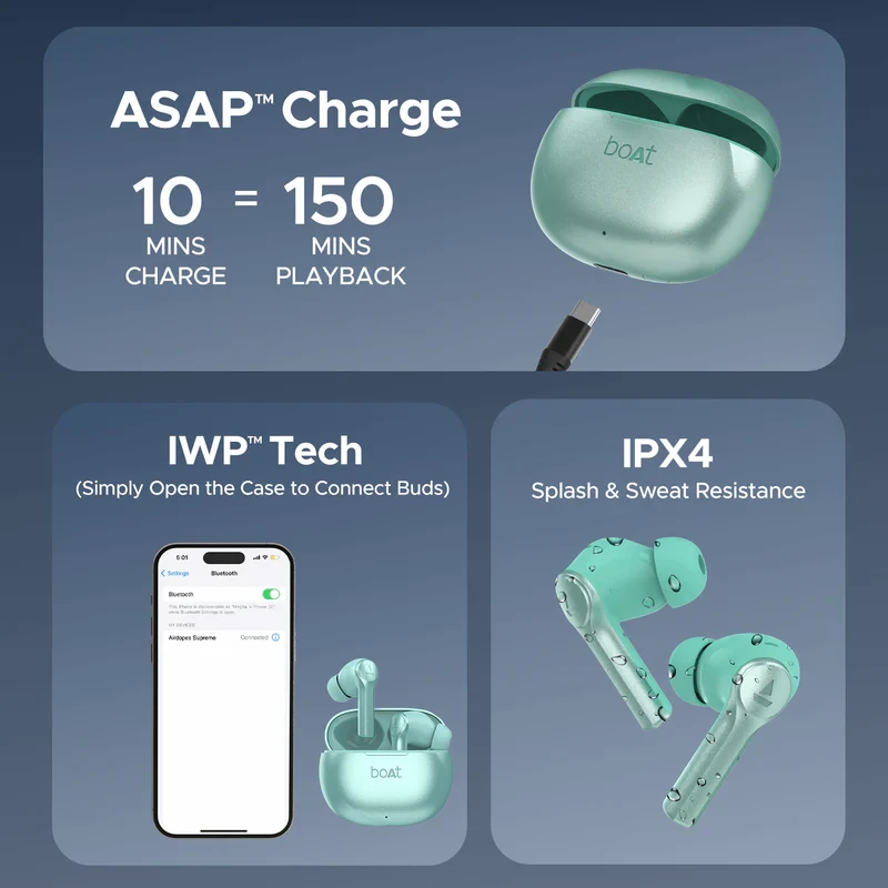 12+3 Months Warranty i 7-day Replacement Free Express Delivery* GST Billing Description Reviews (192) BEAST™ Mode Multi-point Connectivity ASAP™ Charge 50 Hours Playtime Product Specifications Name boAt Airdopes Supreme Category Wireless Earbuds Net Content 1 UNIT boAt Airdopes Supreme, 1 UNIT Type-C Cable, 1 UNIT User Guide, 2 UNITS Extra Earmuffs Product Dimensions 35.21mm x 17.83mm x 21.37mm MRP(Inclusive All Taxes) ₹5,990 Country Of Origin India Marketed By Imagine Marketing Limited, Unit No. 204 & 205, 2nd floor, D-Wing & E- wing, Corporate Avenue, Andheri Ghatkopar Link Road, Andheri East, Mumbai - 400093 Manufactured by Califonix Tech & Manufacturing Pvt. Ltd., B-17, Sector 85, Phase II, Noida, Gautam Buddha Nagar, Uttar Pradesh-201305, India. For consumer complaints contact us at: 022-6918-1920 info@imaginemarketingindia.com Imagine Marketing Limited Address: Unit No. 204&205, D-wing & E-wing, Corporate Avenue, Andheri Ghatkopar Link Road, Andheri East, Mumbai-400093 Net Quantity 1 Unit IPX IPX4 Driver Size 10mm*2 Charging Time 1.5 Hours (Case); 30 Mins (Earbuds) Bluetooth v5.2 Beast Mode Yes BEAST™ Mode 65ms Low Latency ASAP Charge Yes; 10mins = 150mins Noise Cancellation 4 mics ENx™ Technology