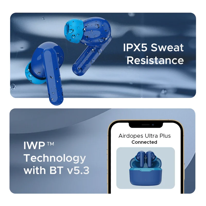12+3 Months Warranty i 7-day Replacement Free Express Delivery* GST Billing Description Reviews (100) BEAST™ Mode Dual Mics with ENx™ Technology ASAP™ Charge 50 HRS Playtime Product Specifications Name boAt Airdopes Ultra Plus Category Wireless Earbuds Net Content 1 Unit Pair of Earbuds, 1 Unit Case, 1 Unit Type - C Cable, 1 Unit User Manual, 1 Unit Warranty Card, 1 Unit FAQ Card Product Dimensions 31.37mm x 20.22mm x 23.83mm MRP(Inclusive All Taxes) ₹4,990 Country Of Origin India Marketed By Imagine Marketing Limited, Unit No. 204 & 205, 2nd floor, D-Wing & E- wing, Corporate Avenue, Andheri Ghatkopar Link Road, Andheri East, Mumbai - 400093 Manufactured by Califonix Tech & Manufacturing Pvt. Ltd., B-17, Sector 85, Phase II, Noida, Gautam Buddha Nagar, Uttar Pradesh-201305, India. For consumer complaints contact us at: 022-6918-1920 info@imaginemarketingindia.com Imagine Marketing Limited Address: Unit No. 204&205, D-wing & E-wing, Corporate Avenue, Andheri Ghatkopar Link Road, Andheri East, Mumbai-400093 Net Quantity 1 Unit IPX IPX5 Driver Size 10 mm*2 Charging Time About 30min (Earbuds) ;up to 1.5 hours (Case) Bluetooth V5.3 Beast Mode Yes BEAST™ Mode 50ms low latency ASAP Charge Yes; 5mins = 60mins Noise Cancellation 4 mics ENx™ Technology Recommended products