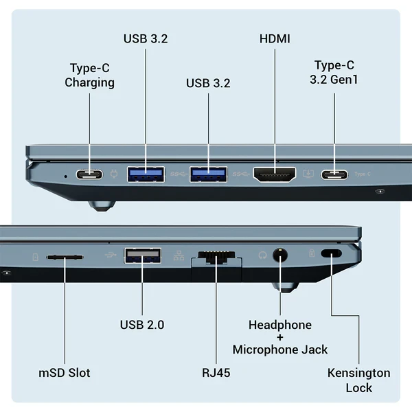 | USB3.2 x2 | USB 2.0 | Type C port x2 | mSD slot | 3.5mm HP | HDMI | RJ45 | |